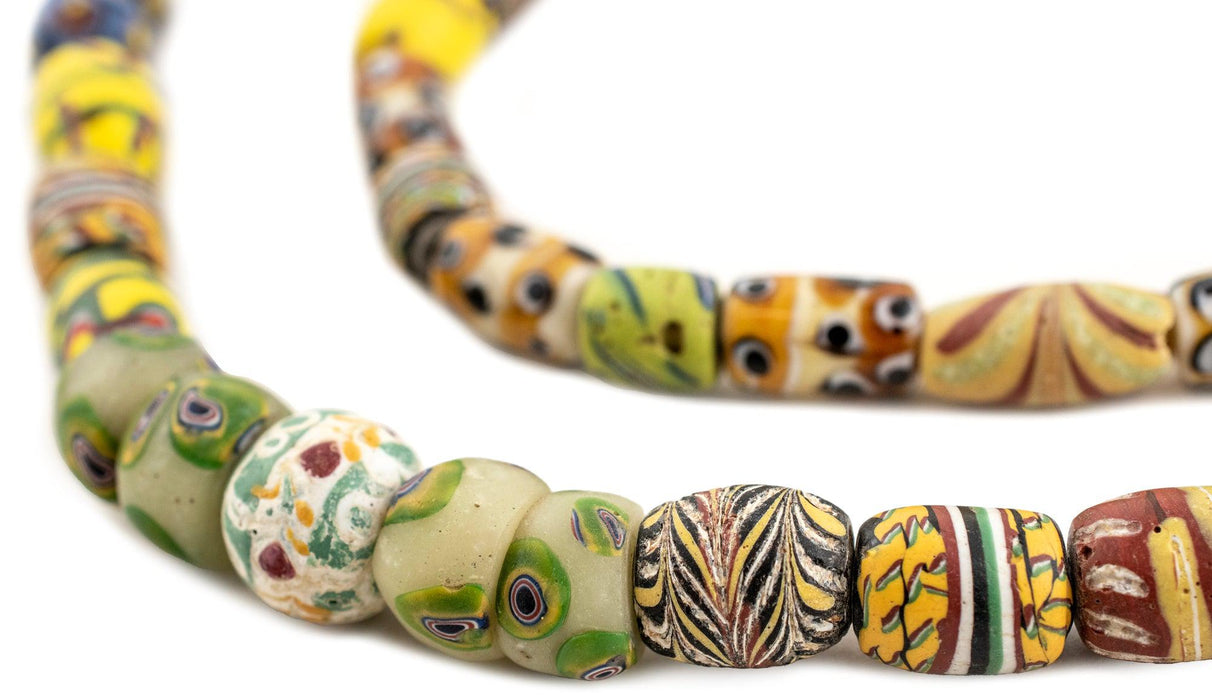 WOW! Take a look at this beautiful antique strand of Venetian Millefiori trade beads! Celebrated among the most distinctive of beads, the Millefiori has become nearly synonymous with the West African Trade. Made from famed Murano glass, Millefiori beads derive their name from the Italian words for “Thousand Flowers” due to the characteristic floral motifs that decorate their surface. Millefiori beads were made throughout the 19th and 20th century primarily for export to Africa. Today they are found in many countries including Ivory Coast, Nigeria, and Ghana where they are also known by their Ashanti name “Chachasao”.