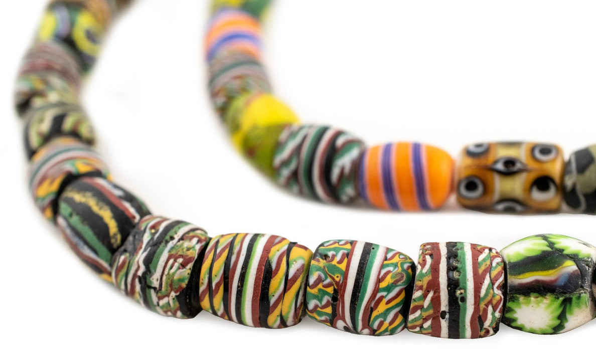 Most beads are commonly cylindrical in shape however oval-shaped beads such as those shown here are more rare and difficult to find. The strand pictured is an authentic strand of African Trade Beads and will include a unique mix of different colored beads. Look carefully and you may see that some rare varieties of Venetian trade beads are also mixed in including feather beads, fancy beads, and rare varieties of French Cross Beads. Some strands may have a small fraction of cylindrical eye beads mixed in. While we do not know the exact provenance of this unusual eye bead, it is possible that it is of Indonesian origin mixed on a strand of mostly Venetian beads. This is an old strand and some beads may be damaged or chipped due to age however it is in overall good condition. Great for the bead connoisseur and amateur collector alike. These unusual beads may be worn “as-is” or may be used as a unique addition to your special beaded jewelry. Don’t miss this chance to own this one-of-a-kind strand today! You will receive the EXACT item pictured.