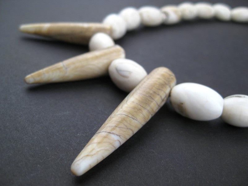 Admire the detail of these unusual beads fashioned by hand in a medley of shapes from the natural shell of the ocean conch. The material for these unique beads is said to have been traded from the Bay of Bengel north towards the Himalayan mountains. No two beads are alike however beads measure approximately 10 x 8-40mm diameter with hole size of . The length of strand measures about 21â€. Each strand is unique and may vary slightly from photo. Beads may be used in your own special jewelry design however the beads have been nicely strung and the strand may also easily be worn as a necklace. Limited quantity available.