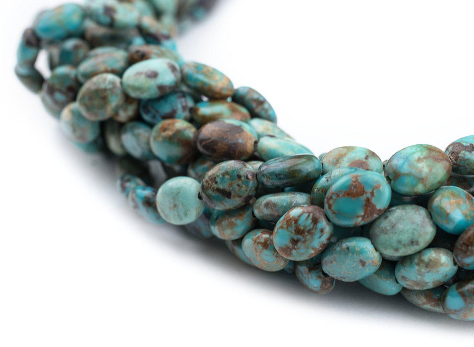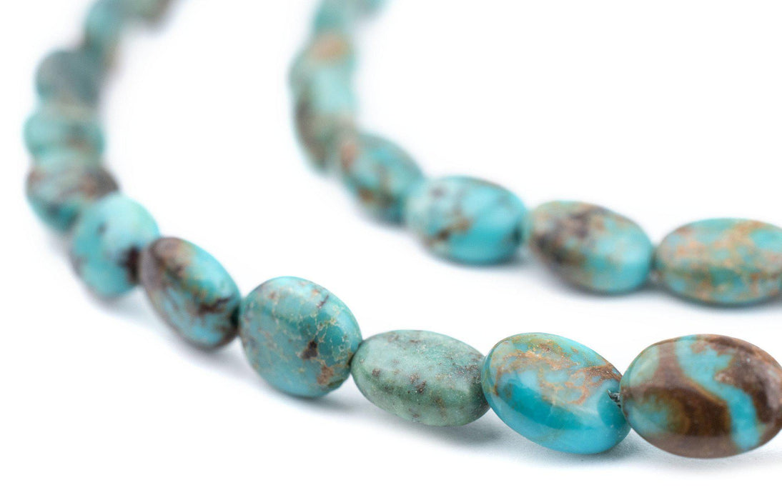 Take a closer look at these amazing Turquoise Oval Beads. Natural Turquoise Beads are so much fun to design with! We suggest pairing these Turquoise beads with other stone beads like Tiger Eye and Sea Sediment Jasper to create rustic earthy jewelry pieces. Each artisan bead strand is approximately 16" in length. Each individual bead is about 8 x 4-6mm with a roughly 1mm stringing hole. Multiple strands pictured. Each strand sold individually. Each strand is unique and may slightly vary from the picture. Add these beads to your collection today!