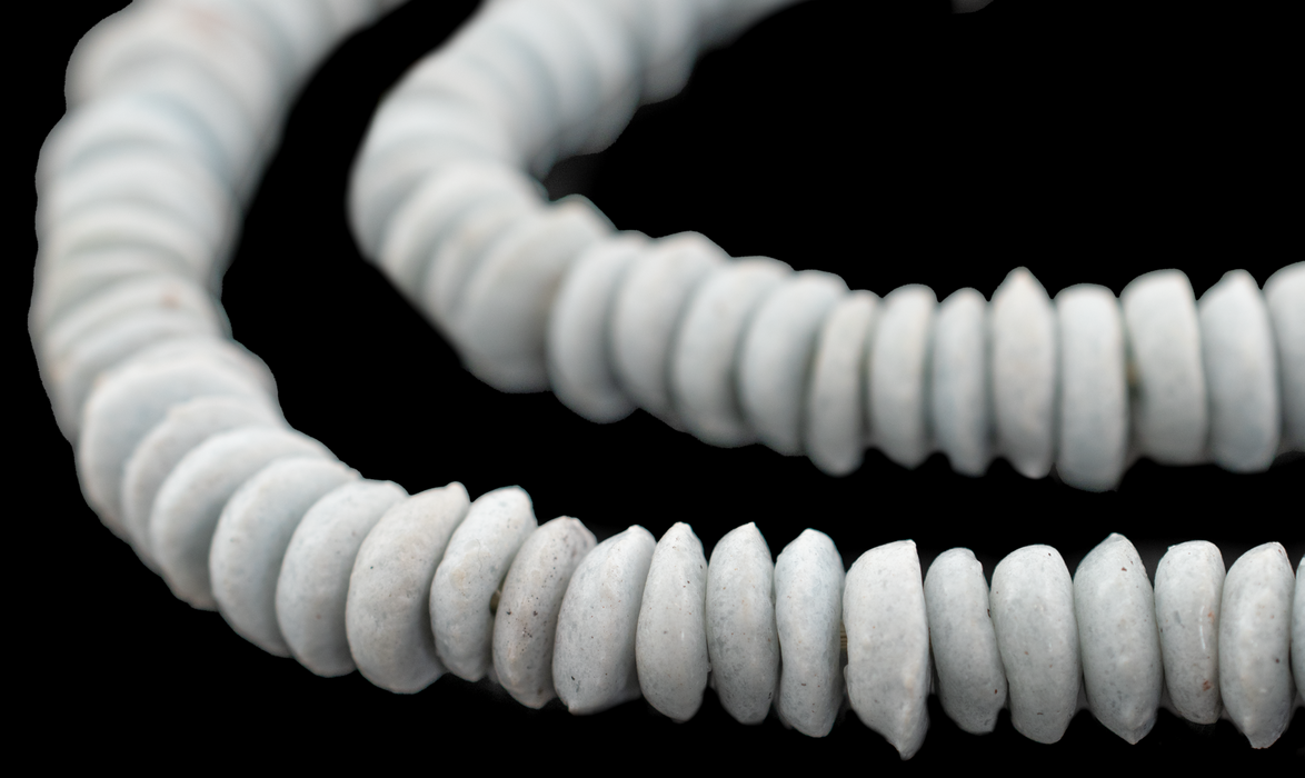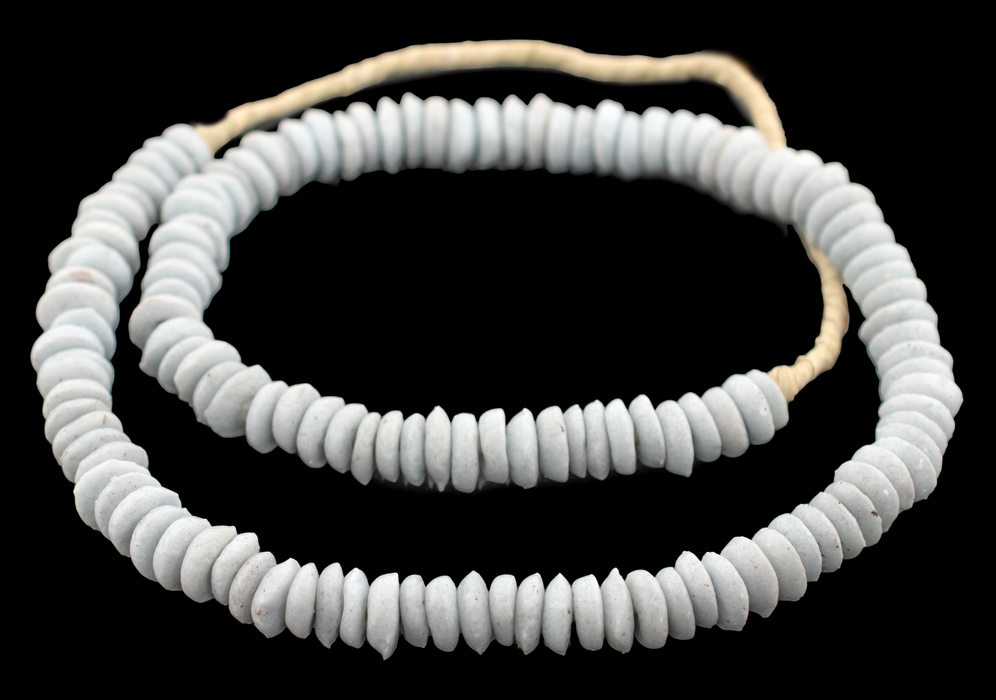 Checkout this beautiful strand of Ashanti glass saucer beads. The process of making these beads is unique to Africa and has been used for over 1000 years. Pulverized glass of various colors is poured into a clay mold, using a cassava stem for the bead's hole. The mold is placed in a furnace and heated until the glass particles congeal without actually melting and the stem burns out. The Ghanaians have been making beads in this manner since the 1600s. Each bead measures approximately 4 x 12mm with a hole size of approximately 2mm. You will receive a full strand measuring approximately 26". Get yours today!