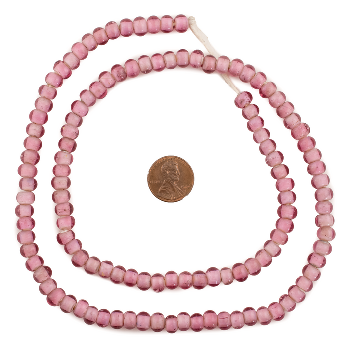 Admire the delicate beauty of these Rose Pink White Heart Beads. Named for their distinctive design, these beads feature an opaque white glass core enveloped in a layer of translucent rose-pink glass. This unique design allows light to pass through, highlighting the vibrant exterior while illuminating the pure white heart within. Originating from the esteemed traditions of French and Czech bead-making, white heart beads were highly valued in African trade, and prized for their beauty and rarity. Each bead measures approximately 5 x 7-8mm with a hole size of about 1mm. You will receive one full strand measuring roughly 26" in length. Available in a variety of sizes, shapes, and colors! Add these stylish beads to your design kit today!