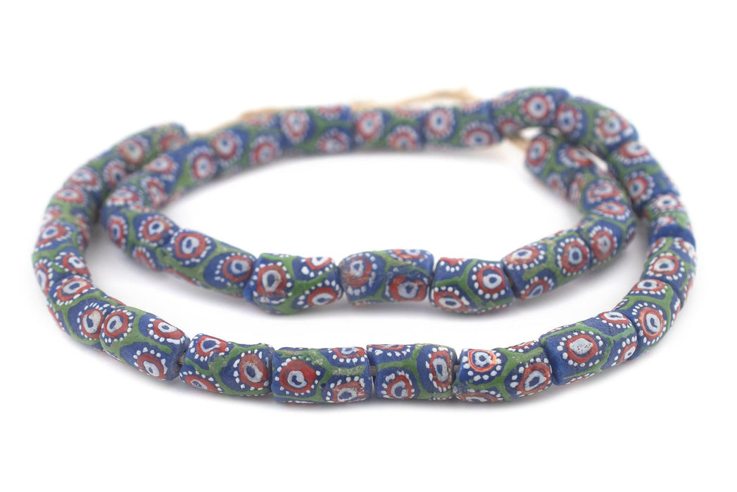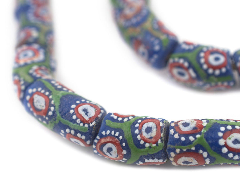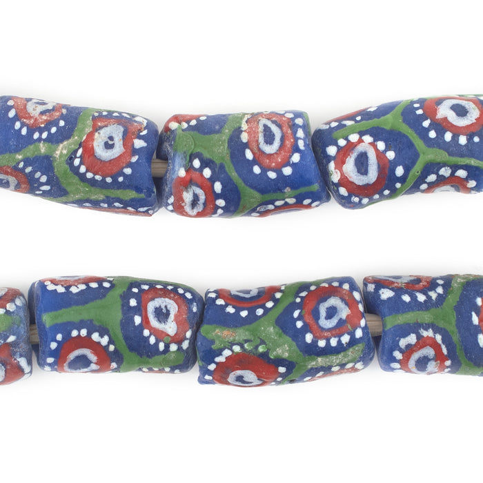 This beautiful strand of African powder glass beads was made by the people of Krobo Mountain in Ghana, West Africa. Many designs of Krobo beads are patterned to resemble old Venetian fancy trade beads. They are made from bottles and other glass items that are turned into powder, then poured into molds in order to create beads. Decorations on the beads are made with a paste made of colored glass powder and water which is applied by hand using a thin wooden stalk. The beads are cooked a second time to fix the decor. Each bead measures approximately 20-22 x 12-13mm with a hole size of approximately 2-3mm. You will receive a full strand measuring approximately 30". Limited supply.