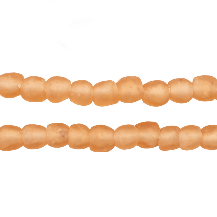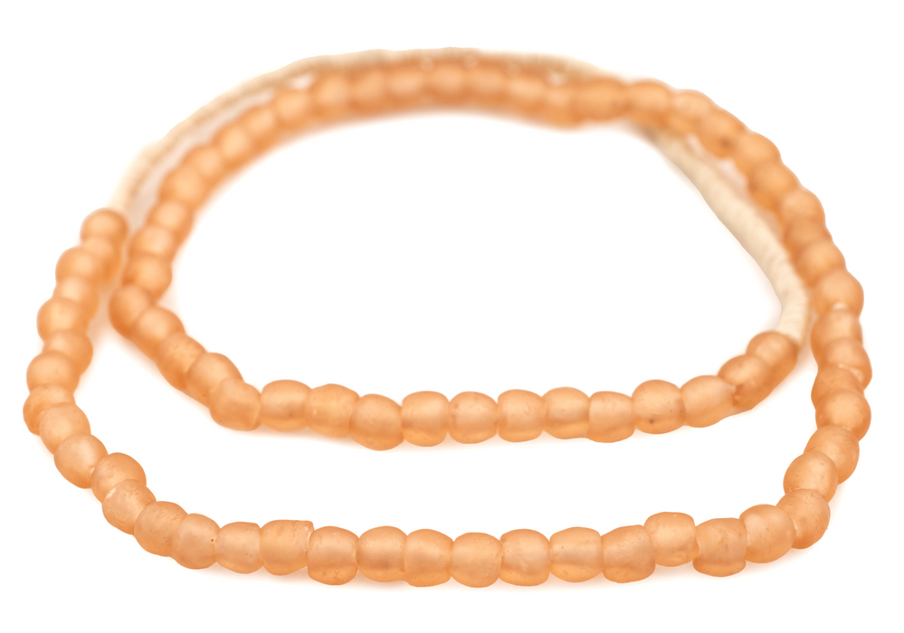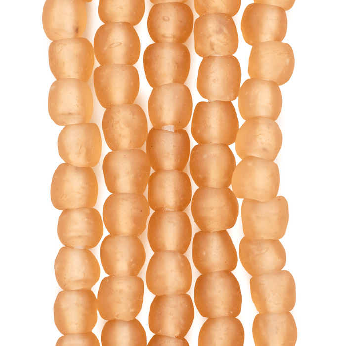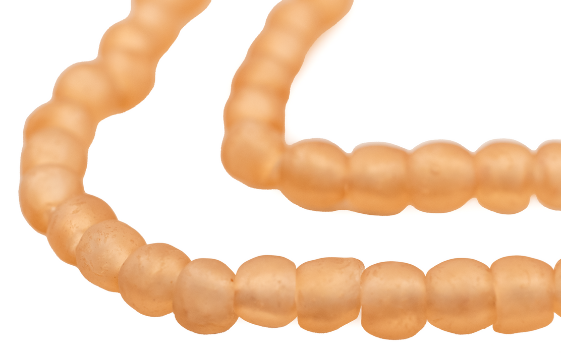 Take a closer look at the rustic charm of our Peach Recycled Glass Beads. These beads are not just adornments; they're a testament to the rich tradition of African bead-making, particularly from Ghana. Crafted with care and skill by the Krobo tribe, these beads are made using an age-old technique that transforms recycled glass from beverage and medicine bottles into stunning pieces of jewelry. The powdered glass is meticulously poured into clay molds and then baked in a specialized oven, resulting in beads that are not only beautiful but also environmentally friendly. Each bead measures about 7mm with a hole size of roughly 2mm. You will receive one full strand measuring approximately 22" in length. Add this strand of eco-friendly recycled glass beads to your design kit today.