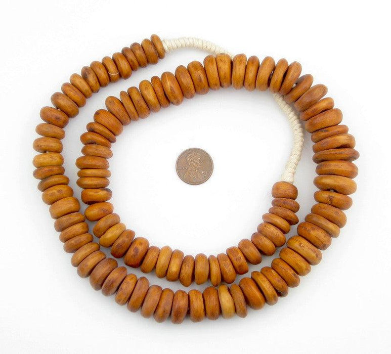 Take a look at this exceptional strand of bone disk beads made in Nigeria from Authentic Camel Bone. Each bead has been individually shaped and polished with craftsmanship that you can really feel. The rich color of these beads is derived from the natural dye of the Henna plant. These graduated beads have been nicely strung and could be easily worn as is or used in your unique jewelry designs. Limited Supply.