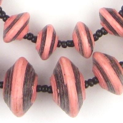 Beautiful strand of larger size pink and black recycled paper beads. These beads are made using recycled paper by working mothers in Uganda. Each bead is fair trade and handmade with love. Individual beads range in size from 7-12mm wide and 14-27mm in diameter with about 32-40 beads on each strand. Some beads may show slight sign of use, as they have passed through hands at African markets. Beads may vary slightly from photo as each strand is individually made by hand. Shade of pink may vary slightly from photo.