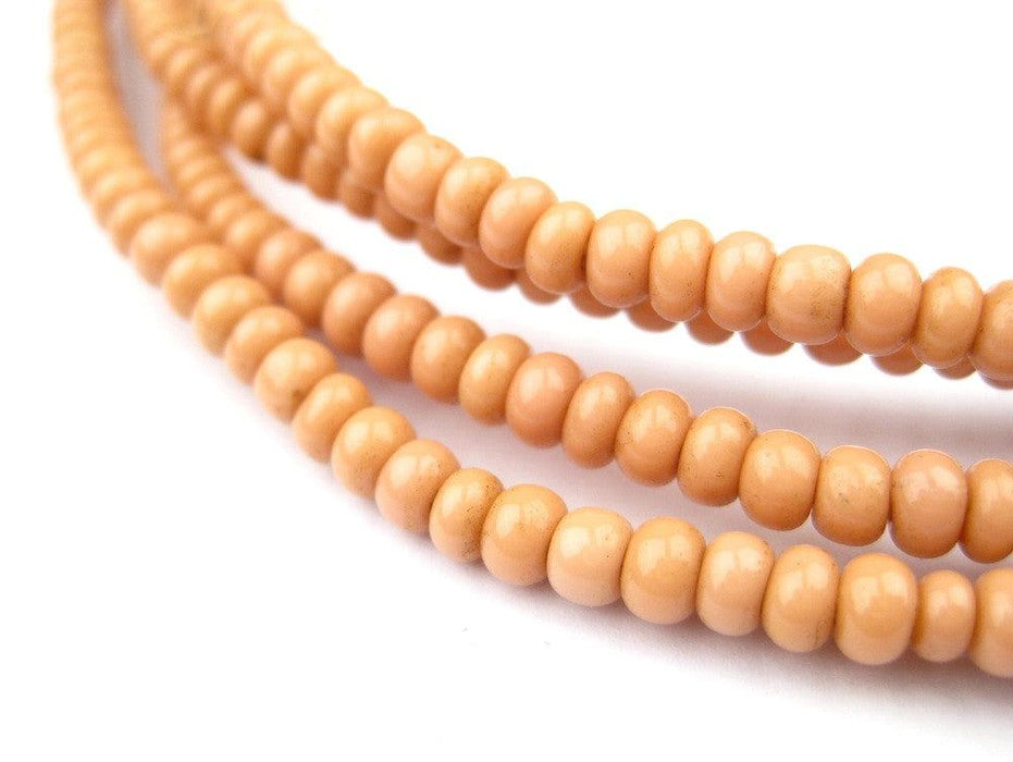 Two strands of pink color small glass beads from Africa. Each bead measures approximately 3mm in length by 4mm in diameter by. Some variation in individual beads as shown pictured.