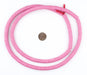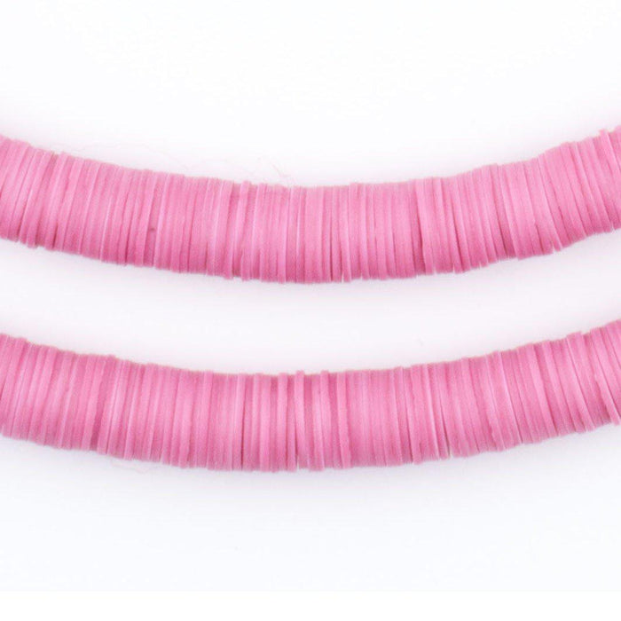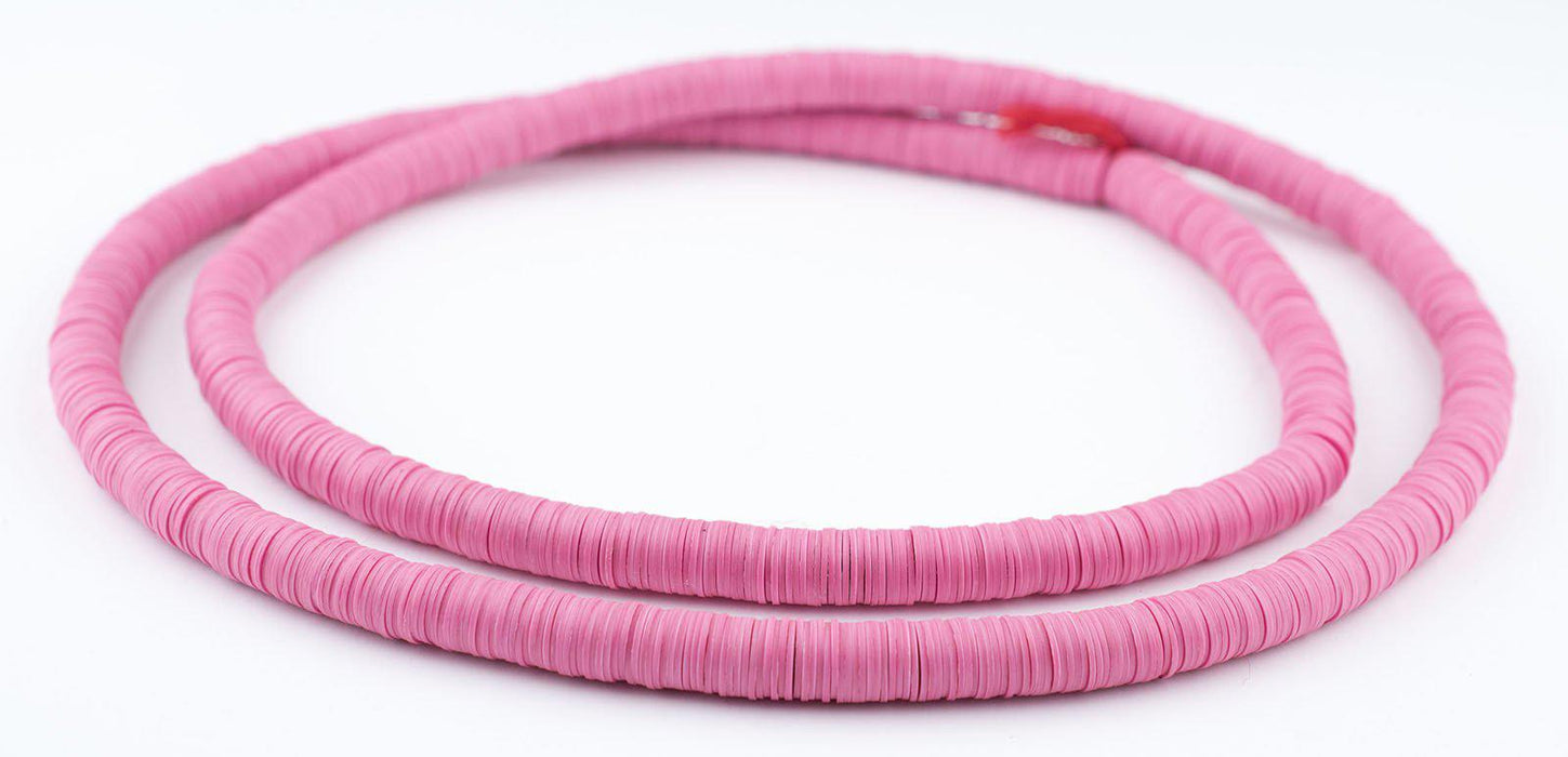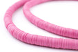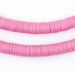 Take a look at this beautiful strand of African vinyl beads pink color. Beads such as these are found in Ghana and Nigeria where they are sometimes worn as waist beads. Older versions of vinyl beads were said to be made from recycled phonograph records. This strand measures approximately 36" long with individual beads measuring 0.28 x 8mm. These beads are light and fun to wear and also versatile for jewelry designs. Each strand is sold individually. Tone of pink may vary slightly from strand to strand.
