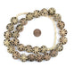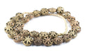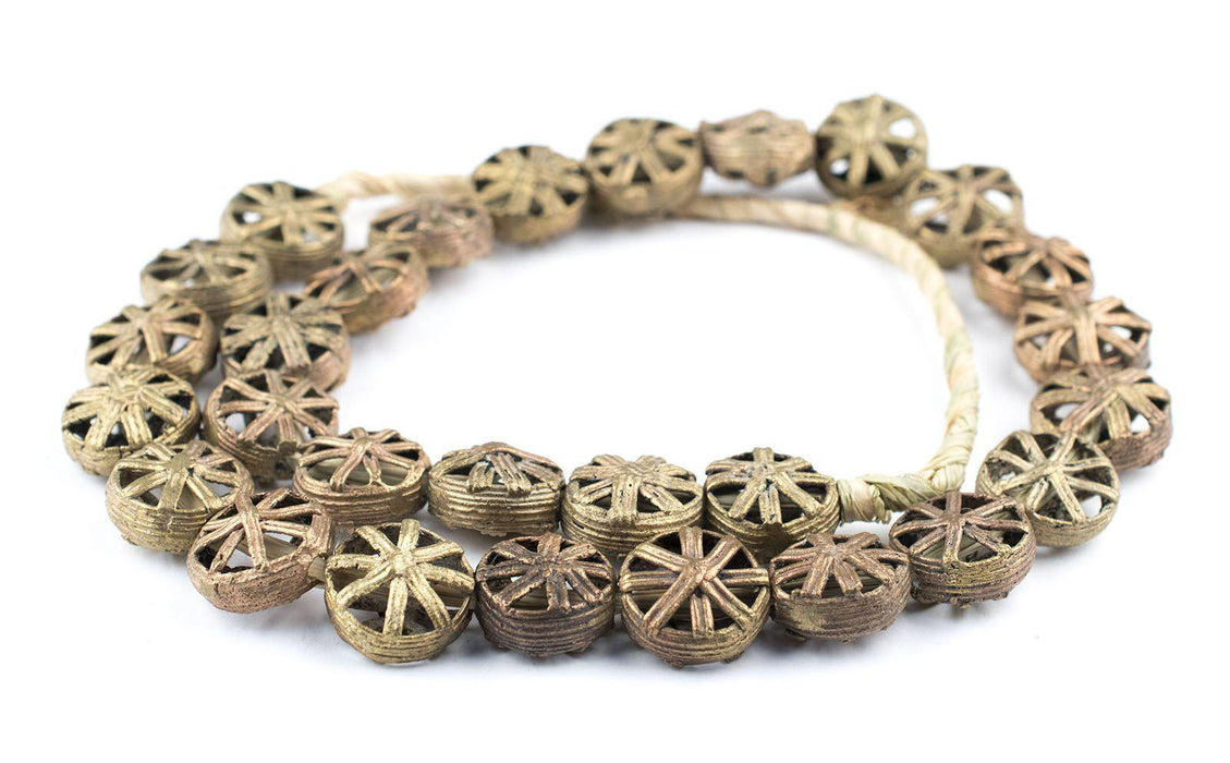 These Brass "Round Flat" trade beads are from Ghana, Africa. Each bead is made individually through the "Lost Wax process" technique. The strand is about 26" long and the beads about 17-19mm in diameter and approximately 10mm. thick. A few beads on the strand may differ in shape.