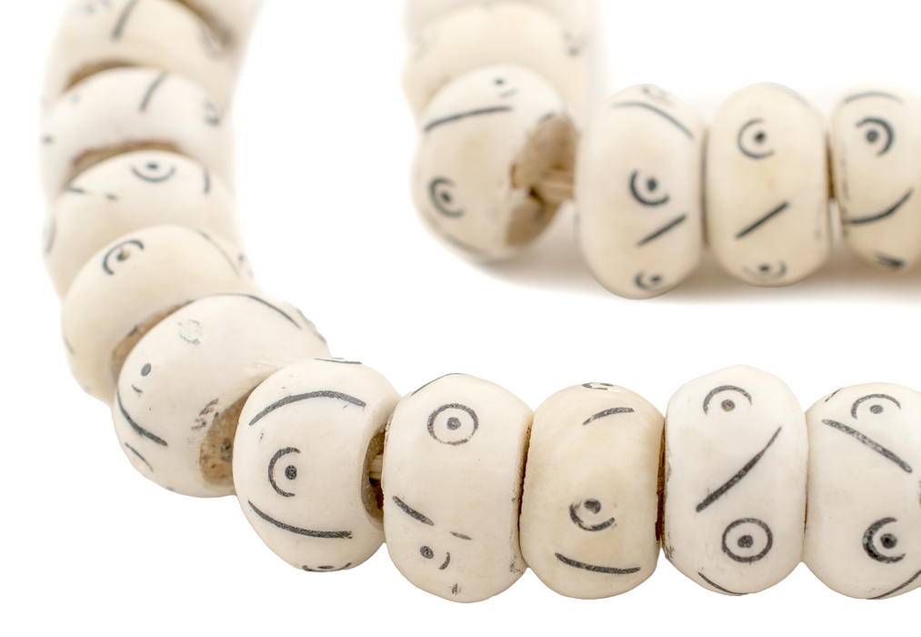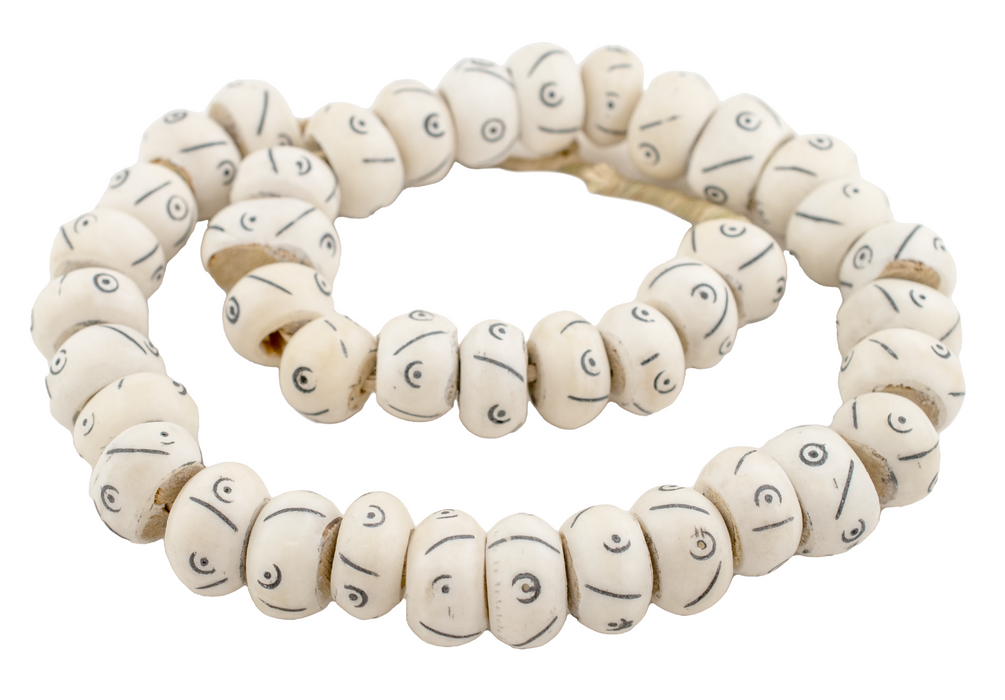 Admire this beautiful strand of bone beads from Kenya. East African bone beads are handcrafted by artisans using recycled cow bone. Each bead is individually carved and polished, and is truly one of a kind.