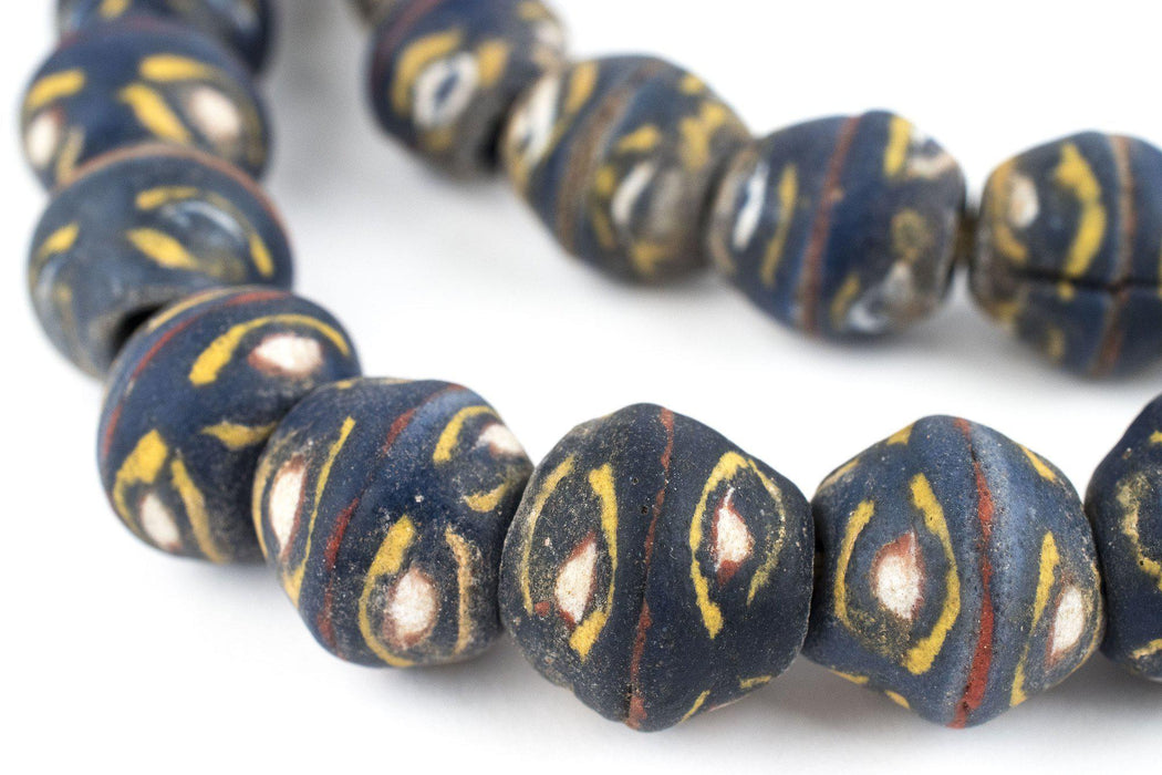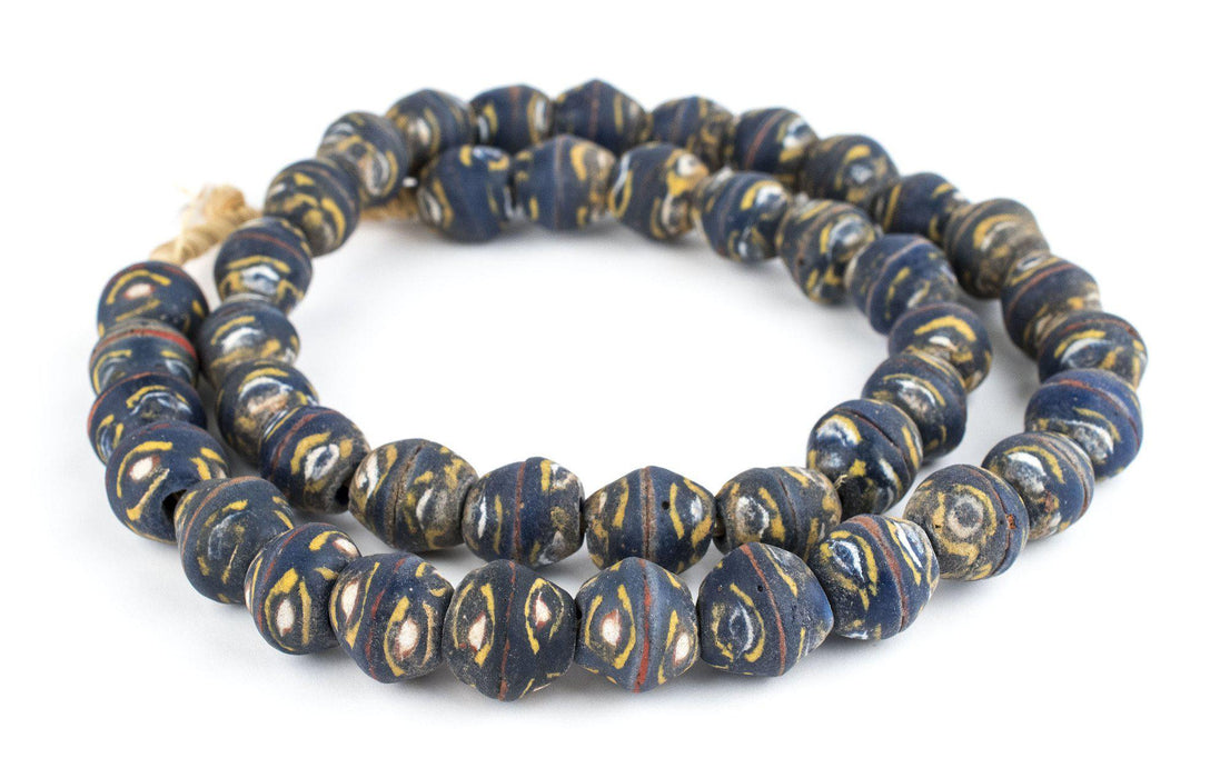 These bicone-shaped beads have been individually fashioned using a traditional African method for bead making. The powdered glass is layered into a mold to create a distinctive pattern. In this case, the design actually resembles Venetian King Beads in both shape and styling. The matte finish of the beads give them a vintage feel. Each bead measures approximately 15-17mm in both dimensions with a hole size of approximately 3mm. These beads are large enough to be used as a focal piece or may be used for home decor. Limited supply.