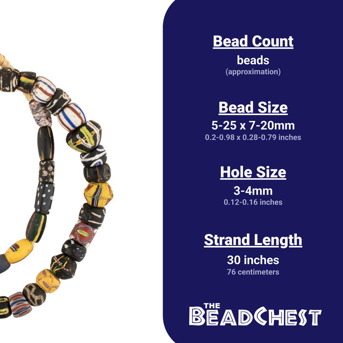 Looking for a truly unique strand of antique mixed trade beads? Then look no further. This deluxe strand of old african trade beads contains a medley of larger size beads. Look carefully and you may see many special beads including Bodom beads, Murano Red good beads, Millefiore, Red white and blue beads, French cross, King beads, Old powder glass beads, Dog tooth beads, Cornaline d'Aleppo Venetian Trade Beads, Russian Blue, Floral Venetian Beads, and many other unusual varieties of old African Trade Beads. These beads are for the designer and collector alike. You will receive the exact strand pictured. Some beads may show signs of age. These mixed beads are truly exceptional!