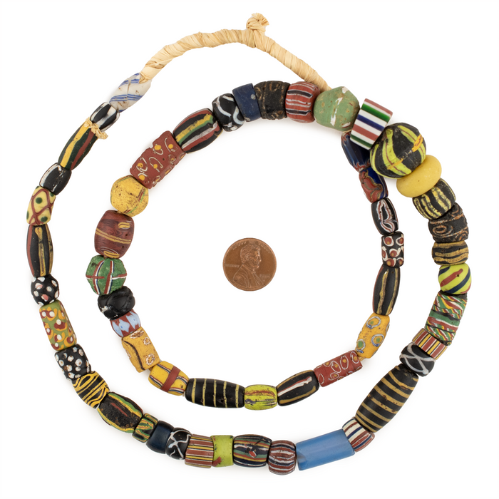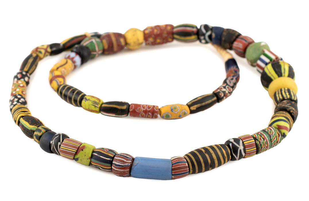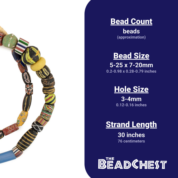 Looking for a truly unique strand of antique mixed trade beads? Then look no further. This deluxe strand of old african trade beads contains a medley of larger size beads. Look carefully and you may see many special beads including Bodom beads, Murano Red good beads, Millefiore, Red white and blue beads, French cross, King beads, Old powder glass beads, Dog tooth beads, Cornaline d'Aleppo Venetian Trade Beads, Russian Blue, Floral Venetian Beads, and many other unusual varieties of old African Trade Beads. These beads are for the designer and collector alike. You will receive the exact strand pictured. Some beads may show signs of age. These mixed beads are truly exceptional!