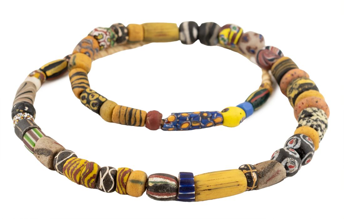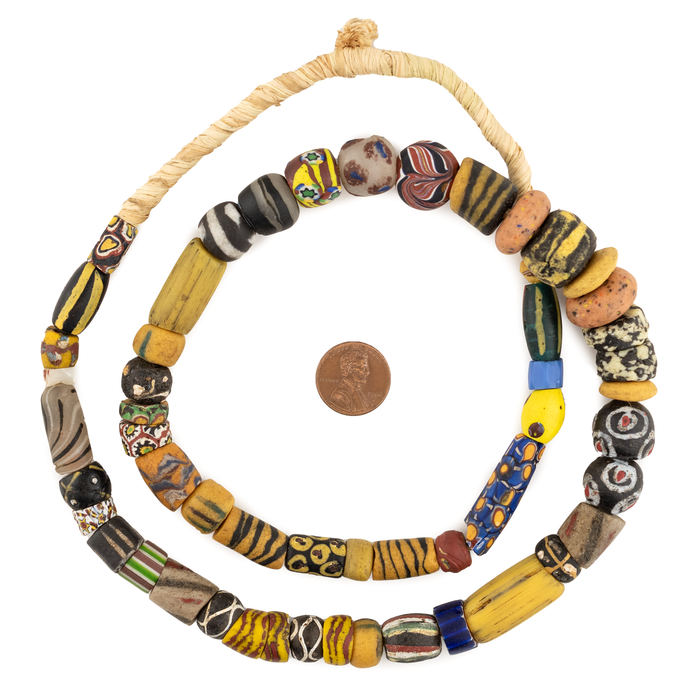 Looking for a truly unique strand of antique mixed trade beads? Then look no further. This deluxe strand of old african trade beads contains a medley of larger size beads. Look carefully and you may see many special beads including Bodom beads, Murano Red good beads, Millefiore, Red white and blue beads, French cross, King beads, Old powder glass beads, Dog tooth beads, Cornaline d'Aleppo Venetian Trade Beads, Russian Blue, Floral Venetian Beads, and many other unusual varieties of old African Trade Beads. These beads are for the designer and collector alike. You will receive the exact strand pictured. Some beads may show signs of age. These mixed beads are truly exceptional!