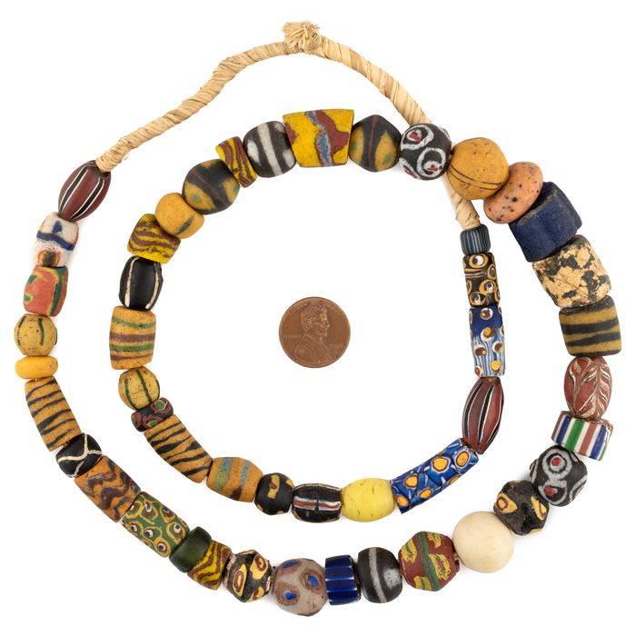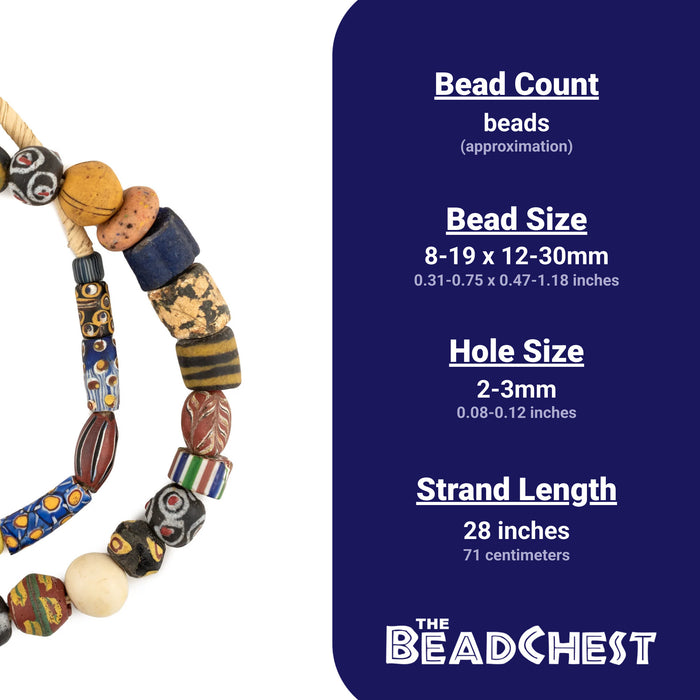Looking for a truly unique strand of antique mixed trade beads? Then look no further. This deluxe strand of old african trade beads contains a medley of larger size beads. Look carefully and you may see many special beads including Bodom beads, Murano Red good beads, Millefiore, Red white and blue beads, French cross, King beads, Old powder glass beads, Dog tooth beads, Cornaline d'Aleppo Venetian Trade Beads, Russian Blue, Floral Venetian Beads, and many other unusual varieties of old African Trade Beads. These beads are for the designer and collector alike. You will receive the exact strand pictured. Some beads may show signs of age. These mixed beads are truly exceptional!