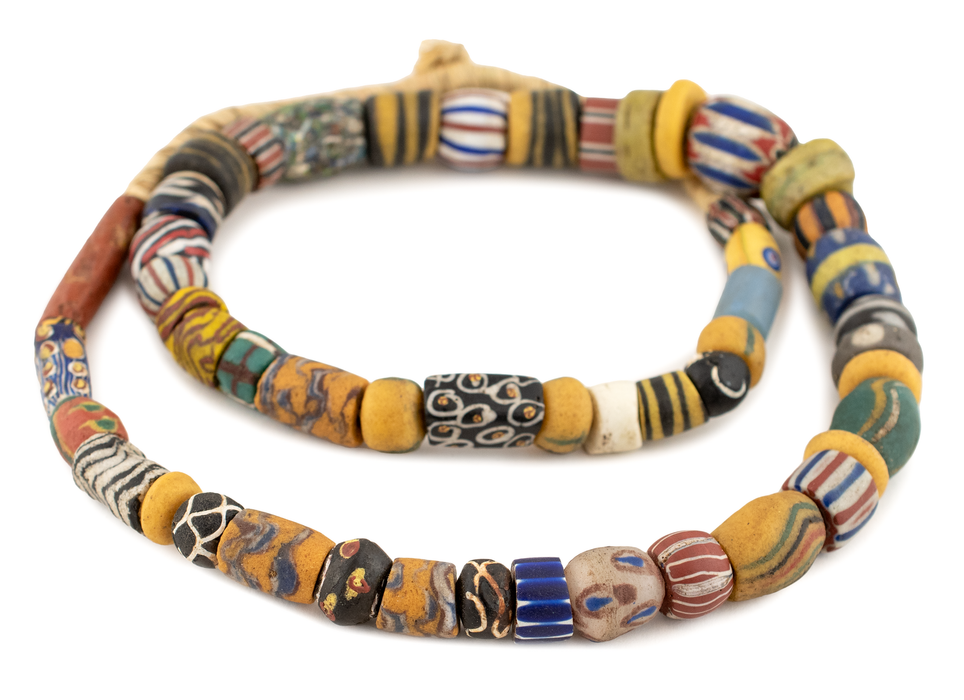 Looking for a truly unique strand of antique mixed trade beads? Then look no further. This deluxe strand of old african trade beads contains a medley of larger size beads. Look carefully and you may see many special beads including Bodom beads, Murano Red good beads, Millefiore, Red white and blue beads, French cross, King beads, Old powder glass beads, Dog tooth beads, Cornaline d'Aleppo Venetian Trade Beads, Russian Blue, Floral Venetian Beads, and many other unusual varieties of old African Trade Beads. These beads are for the designer and collector alike. You will receive the exact strand pictured. Some beads may show signs of age. These mixed beads are truly exceptional!