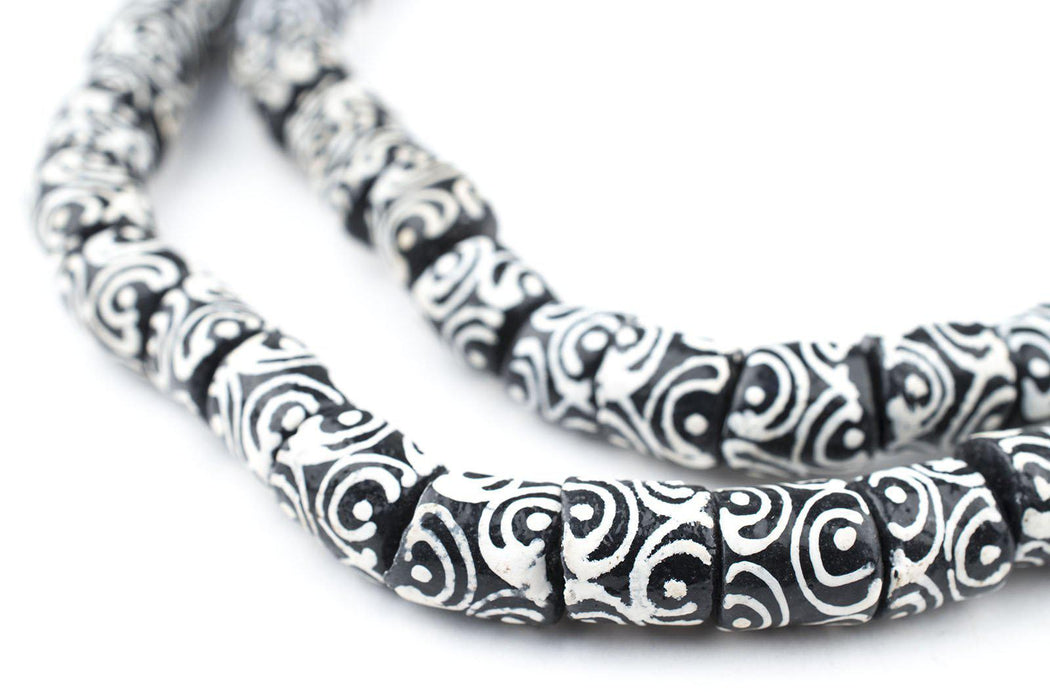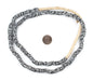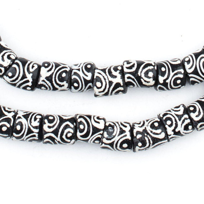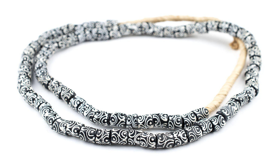A beautiful strand of powder glass African beads, made by the people of Krobo Mountain in Ghana, West Africa. Many designs of Krobo beads are patterned to resemble old Venetian FANCY trade beads. Made from bottles and other glass items that are turned into powder, then poured into molds in order to create these cylinder shaped beads. Decorations on the beads are made with a paste made of colored glass powder and water which is applied by hand using a thin wooden stalk. The beads are cooked a second time to fix the decor. Each bead is unique and will measure approximately 8-9 x 8mm. Strand may vary slightly from picture.
