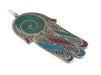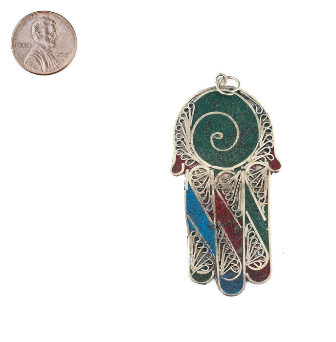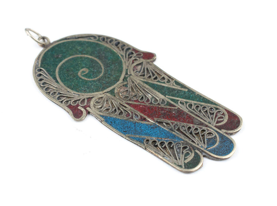Admire this beautiful hamsa pendant made by Berber artisans in southern Morocco. In Moroccan culture, Hamsas are said to ward off evil spirits. Pay attention to the intricate level of detail and care given in each design. Each hamsa pendant in our Berber collection is handcrafted and set with a stone-style centerpiece or enamel coating. This pendant measures 62 x 9-31mm with a hole size of 2mm. Limited supply available. Exact content of sterling is unknown.