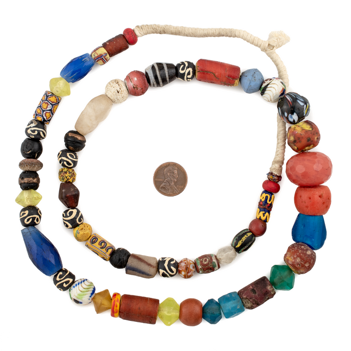 Looking for a truly unique strand of antique mixed trade beads? Then look no further. This beautiful strand of old african trade beads contains a medley of hard to find beads. Each strand is unique but strands may include special beads including Bodom beads, Murano Red good beads, Millefiore, Red white and blue beads, French cross, King beads, Old powder glass beads, Dog tooth beads, Cornaline d'Aleppo Venetian Trade Beads, Russian Blue, Floral Venetian Beads, and many other unusual varieties of old African Trade Beads. These beads are for the designer and collector alike. You will receive the exact strand pictured. Some beads may be cracked and/or show signs of age. These mixed beads are truly exceptional!