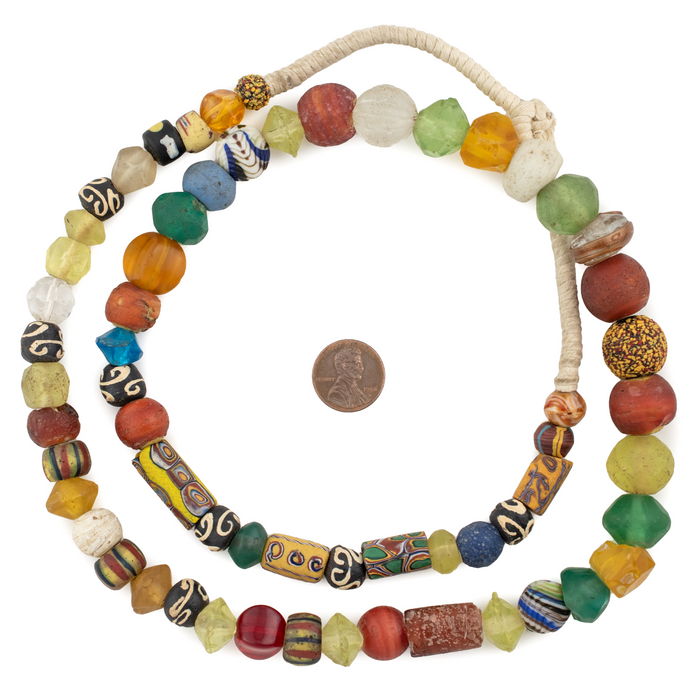 Looking for a truly unique strand of antique mixed trade beads? Then look no further. This beautiful strand of old african trade beads contains a medley of hard to find beads. Each strand is unique but strands may include special beads including Bodom beads, Murano Red good beads, Millefiore, Red white and blue beads, French cross, King beads, Old powder glass beads, Dog tooth beads, Cornaline d'Aleppo Venetian Trade Beads, Russian Blue, Floral Venetian Beads, and many other unusual varieties of old African Trade Beads. These beads are for the designer and collector alike. You will receive the exact strand pictured. Some beads may be cracked and/or show signs of age. These mixed beads are truly exceptional!