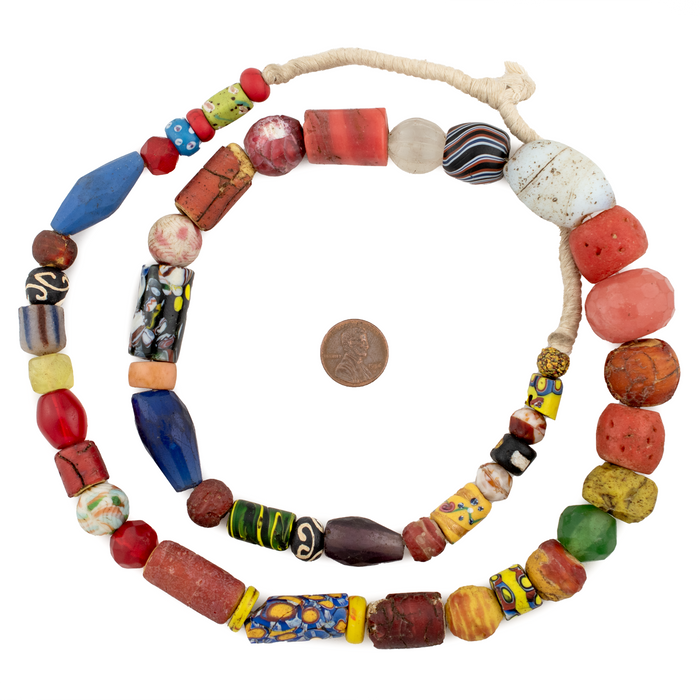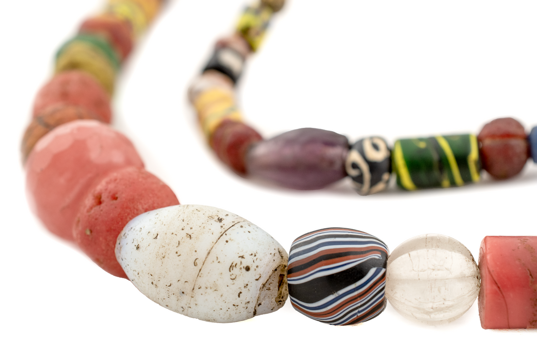 Looking for a truly unique strand of antique mixed trade beads? Then look no further. This beautiful strand of old african trade beads contains a medley of hard to find beads. Each strand is unique but strands may include special beads including Bodom beads, Murano Red good beads, Millefiore, Red white and blue beads, French cross, King beads, Old powder glass beads, Dog tooth beads, Cornaline d'Aleppo Venetian Trade Beads, Russian Blue, Floral Venetian Beads, and many other unusual varieties of old African Trade Beads. These beads are for the designer and collector alike. You will receive the exact strand pictured. Some beads may be cracked and/or show signs of age. These mixed beads are truly exceptional!