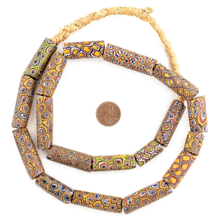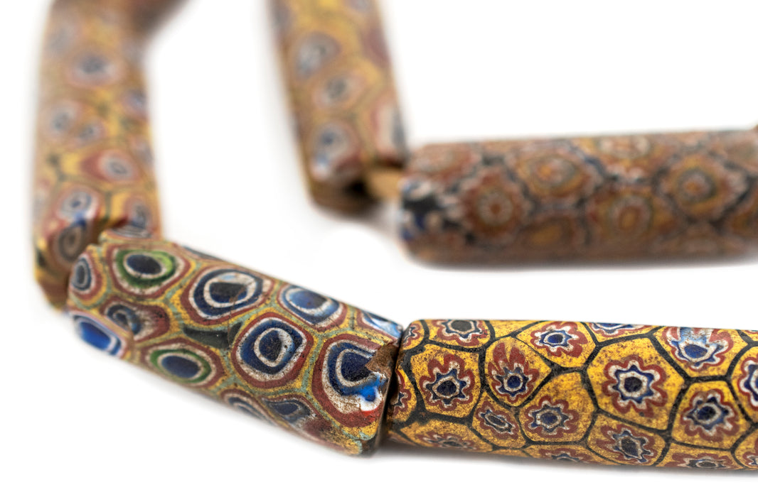 Take a look at this beautiful antique strand of Venetian Millefiori trade beads! Celebrated among the most distinctive of beads, the Millefiori has become nearly synonymous with the West African Trade. Made from famed Murano glass, Millefiori beads derive their name from the Italian words for “Thousand Flowers” due to the characteristic floral motifs that decorate their surface. Millefiori beads were made throughout the 19th and 20th century primarily for export to Africa. Today they are found in many countries including Ivory Coast, Nigeria, and Ghana where they are also known by their Ashanti name “Chachasao”. Most beads are commonly cylindrical in shape but other varieties exist including rectangular, oval, and sometimes even hexagonal beads. Strands in good condition with smooth beads like this are much harder to find. You will receive the exact strand pictured. Measurements are approximations.