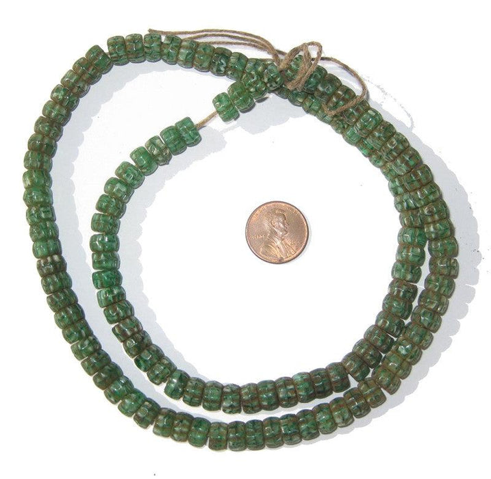 This is a strand of pressed glass beads is called They date back from the early 1900's. These beads have been molded and the strand is in pretty good condition. It has a nice green color and is great to be used as spacers. The beads are approximately 8mm in diameter