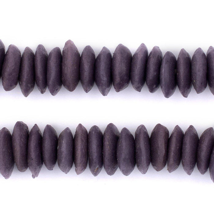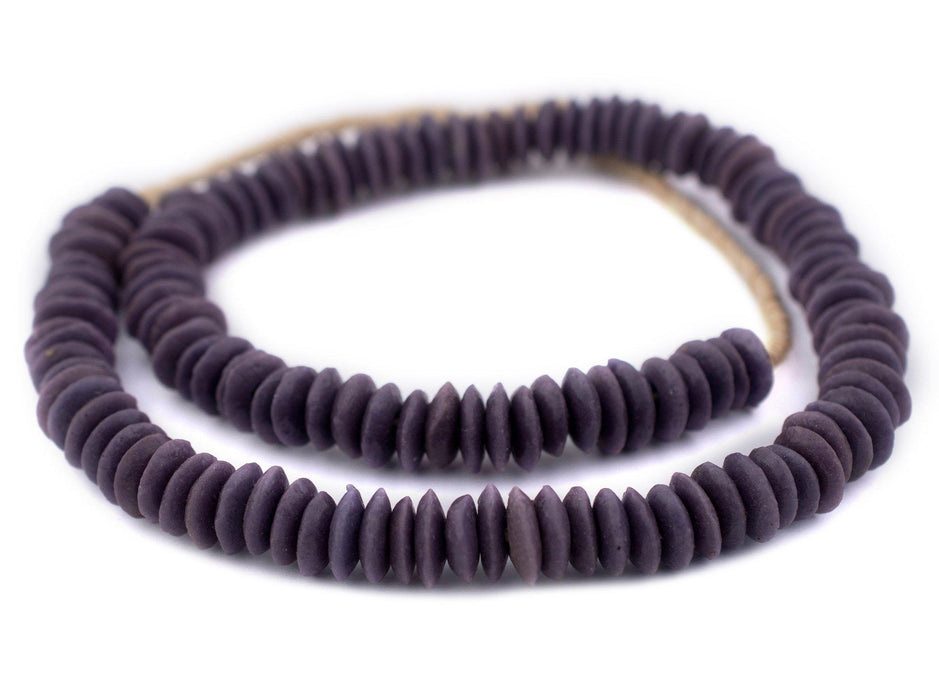 Checkout this beautiful strand of purple color Ashanti glass saucer beads. The process of making these beads is unique to Africa and has been used for over 1000 years. Pulverized glass of various colors is poured into a clay mold, using a cassava stem for the bead's hole. The mold is placed in a furnace and heated until the glass particles congeal without actually melting and the stem burns out. The Ghanaians have been making beads in this manner since the 1600s. Each strand measures approximately 28", which beads measuring approximately 4-6 x 13-14mm in diameter. Get yours today!