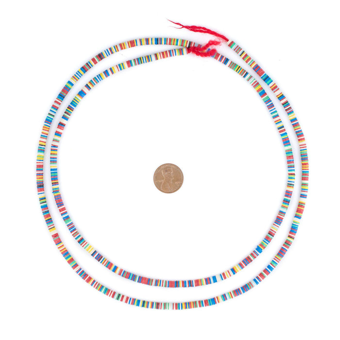 Take a look at this beautiful strand of African vinyl beads in a multicolor color. Beads such as these are found in Ghana and Nigeria where they are sometimes worn as waist beads. Older versions of vinyl beads were said to be made from recycled phonograph records. This strand measures approximately 39" long with individual beads measuring 1 x 4mm. These beads are light and fun to wear and also versatile for jewelry designs. Each strand is sold individually.