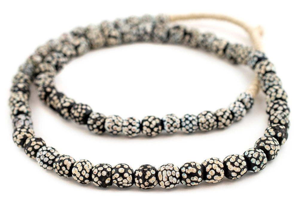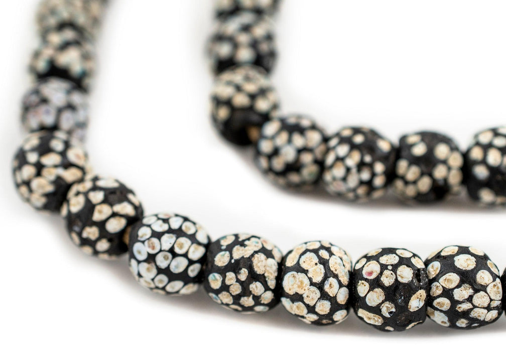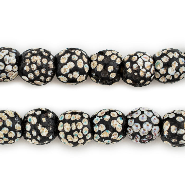 These exceptional black Thousand Eye beads are a beauty to behold. Old trade beads such as these originate in Venice, Italy where they were produced and sent to Africa. Black skunk beads are found in a number of different variants both in East Africa as well as West Africa in countries such as Ethiopia, Ghana, and Nigeria. Thousand Eye Beads are a distinctive variety of skunk eye beads noted for the high number of white dots. These particular beads pictured are specifically found in West Africa and have been strung on raffia. Individual beads measure approximately 10-11mm in diameter with approximately 68 beads on the strand. You will receive the exact strand pictured. Hard to find!