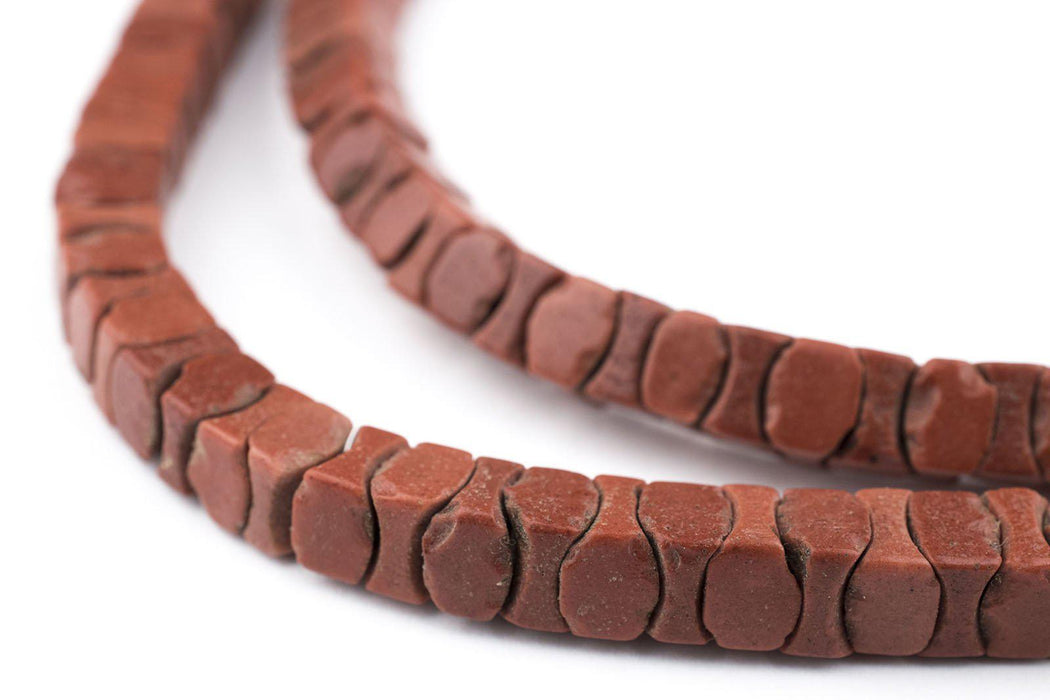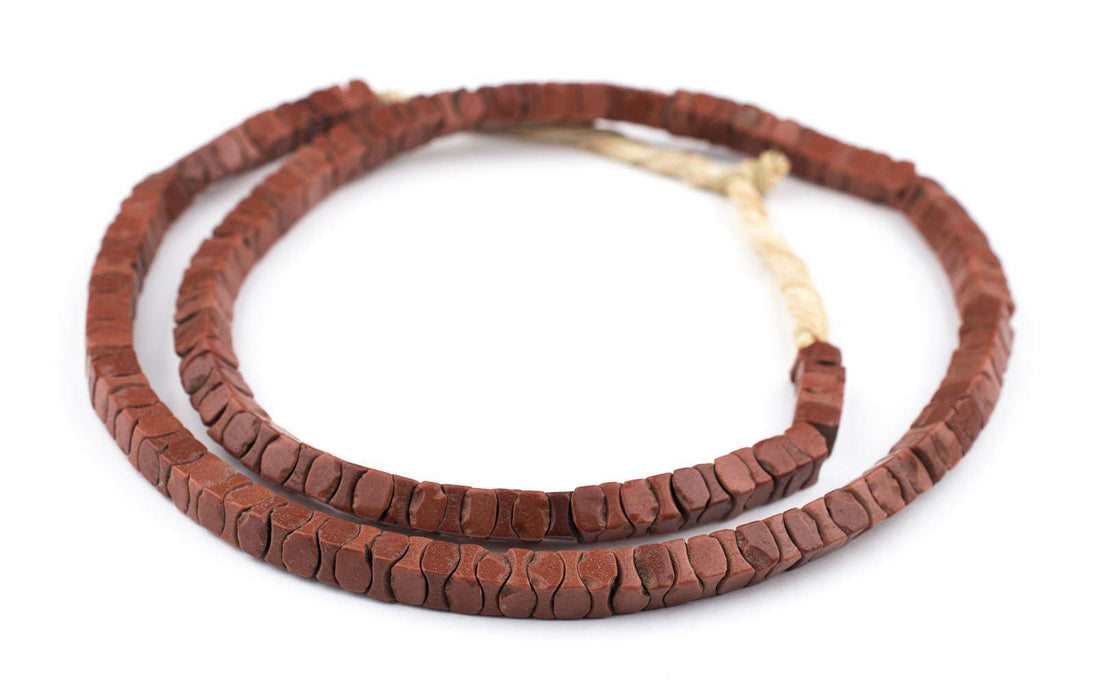 These brown vintage beads are a rare variety of the glass snake bead. Likely of Czech origin, they derive their name from the interlocking beads that resemble the movement of a snake. Square snake beads such as these are few in number and an unusual find. Each strand measures approximately 25-27" in length with individual beads 4-5mm wide and 7mm in diameter. Limited supply.