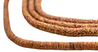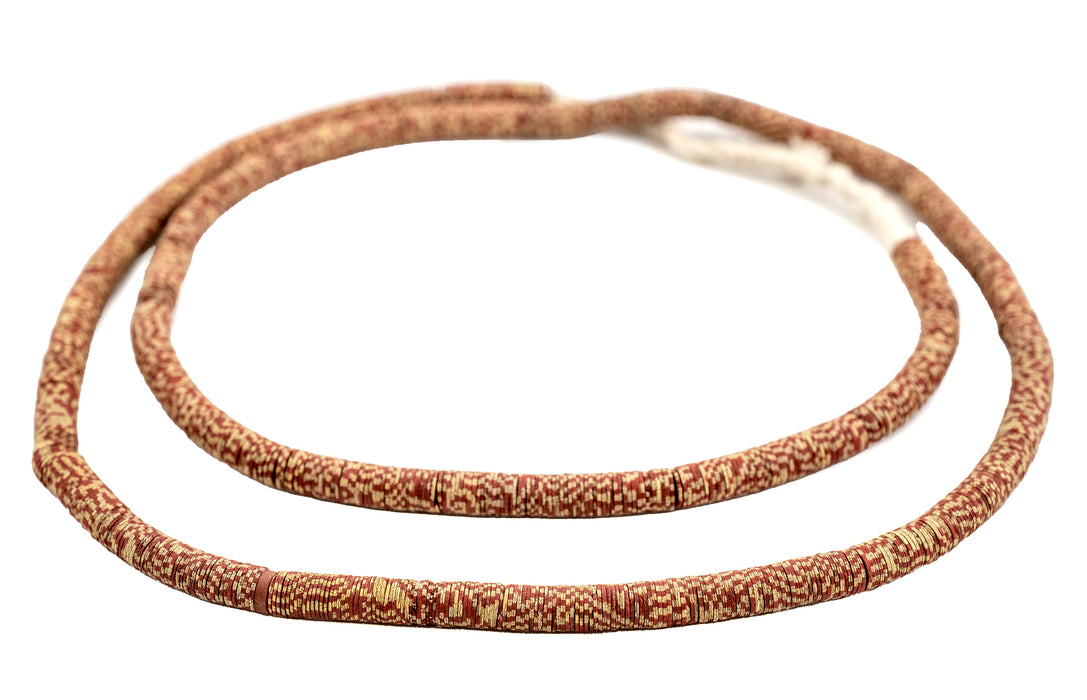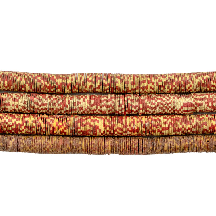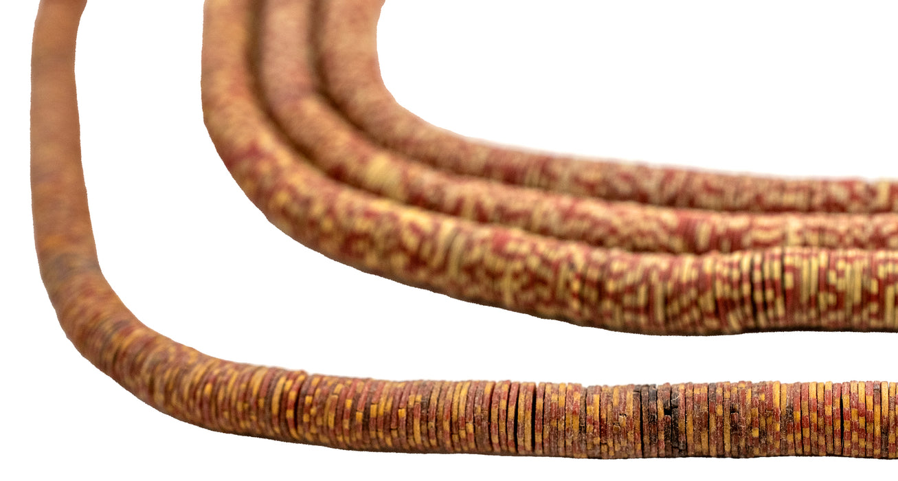 Admire this unique strand of vintage vinyl heishi beads. Commonly found in solid colors, patterned vinyl beads such as these are rare to find and coveted by designers and collectors alike. African vinyl beads are commonly found in West Africa, especially Ghana and Nigeria where they are worn as waist beads or as part of a traditional costume. Whether you like to create a bold statement or something more subtle, these vintage beads are perfect for adding a unique touch to your designs. Each bead measures about <1 x 4-5mm with a hole size of approximately <1mm. You will receive a full strand measuring roughly 22". Grab a strand for yourself and add a retro look to your design kit or decorating project today. These are older beads and will show some signs of age. Each strand is unique and may vary slightly from photo.