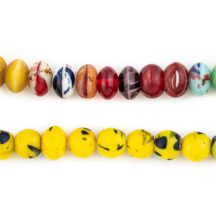 The unique look of Kakamba beads is easily recognized among the beads of Africa. Originally produced in former Czechoslovakia, these beads are made using a special process whereby glass is pressed in a mold. Also known as Prosser beads, these fun vintage African trade beads come in a variety of different colors and combinations. While these beads typically come in an abacus or rondelle shape, this more rare variety is spherical. Each bead measures approximately 6-8 x 7-8mm, with a hole size of <1mm. You will receive the exact strand pictured measuring approximately 37". There are around 120 beads on the strand. Grab this strand for yourself before it's gone.