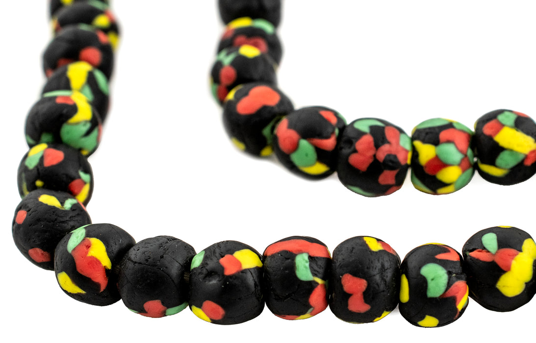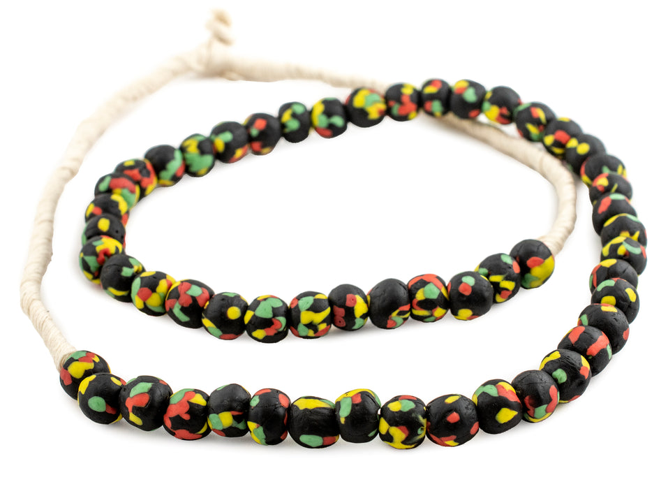 Recycled glass beads are a type of indigenous craft from Ghana in West Africa. These beads have been nicely fashioned in recognizable Rasta colors using using an old method that has been applied for centuries. The glass itself is typically derived from a variety of recycled sources including old beverage and medicine bottles. The procedure for making the beads consists of a number of steps whereby powdered glass is poured into molds of clay and baked in a specialized oven. These beads are produced in large part by the Krobo tribe. Individual beads measure approximately 7-9 x 10-11mm with a hole size of 2-3mm. You will receive a full strand measuring approximately 30". May be worn or repurposed in your own creations. Each strand is unique and may vary slightly from photo.