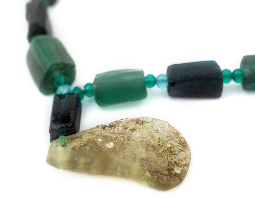 Admire this unique strand of beads made from ancient glass pieces found in the region along the historic silk road. Commonly referred to as Roman Glass, the material for these beads is derived from ancient cups, vases, and perfume containers that have sustained the travails of time. If you look carefully, you will see that these beads have a unique patina endowed by the mineral deposits where the glass lay buried. Each glass piece has been individually drilled and threaded to create a strand. No two strands are alike but you will receive a strand similar to that pictured. Some strands may have a pendant while others may not. Get yours today! Note that while the material is said to be of old, possibly ancient origin, the precise age of the glass has not been independently verified.
