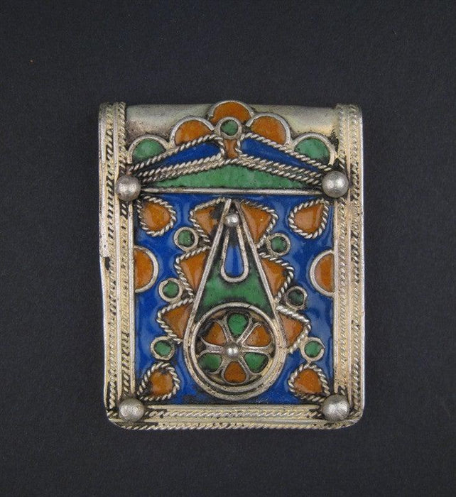 Unique pendant with unusual design. This enameled pendant is decorated with several colors and made using traditional techniques known to have been used by Jewish metal smiths. Jews are known to have lived in Morocco for nearly 2000 years and in historic terms were known for the talent at working metal and making jewelry. To this day, many artisanal metal designs are inspired by their ancient tradition.