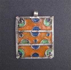 This rectangular enameled Berber pedant will add a colorful twist to any necklace. May be worn 'as is' or as part of a unique design. Each pendant is slightly different and may show some signs of age. Pendant measures approximately 35-40 x 45-48mm.