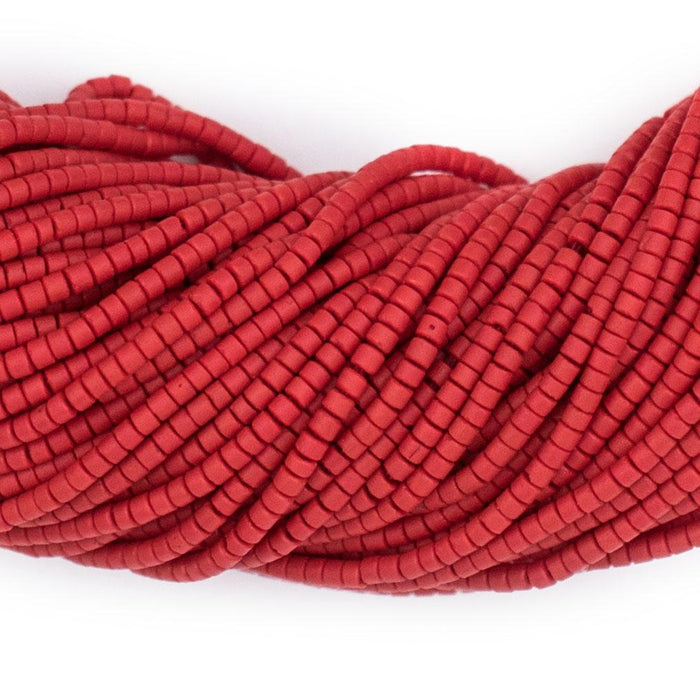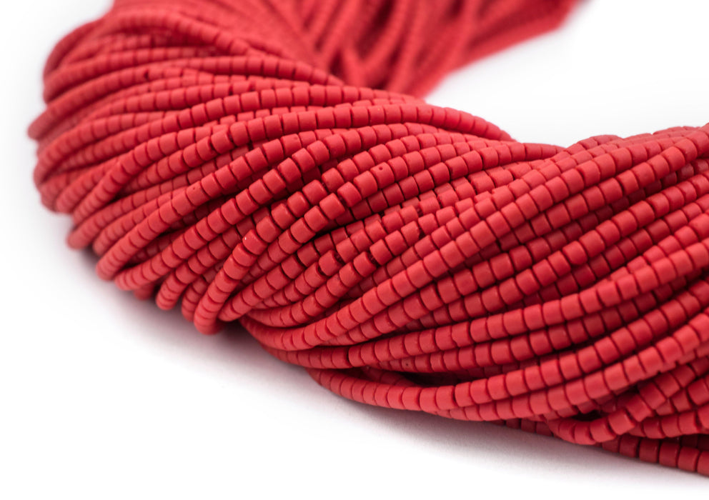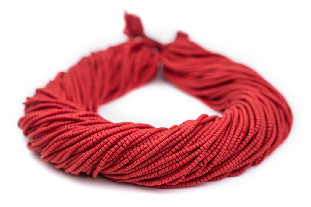 Beautiful strand of red tiny glass seed beads from Afghanistan. These beads measure 1x2mm, with a hole size of less than 1mm. Handmade in a village not far from the Afghan-Pakistan border, these small treasures are fruition of a timeless tradition of bead-making that dates back centuries. Multiple strands pictured. Sold in sets of 10 strands.