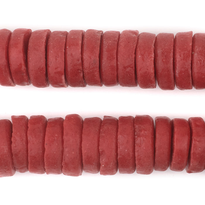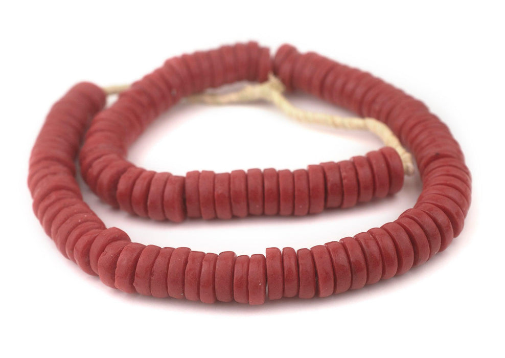 Checkout this beautiful strand of Ashanti glass saucer beads. The process of making these beads is unique to Africa and has been used for over 1000 years. Pulverized glass of various colors is poured into a clay mold, using a cassava stem for the bead's hole. The mold is placed in a furnace and heated until the glass particles congeal without actually melting and the stem burns out. The Ghanaians have been making beads in this manner since the 1600s. Each bead measures approximately 6 x 17-18mm with a hole size of approximately 3-4mm. You will receive a full strand measuring approximately 28".