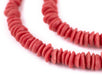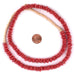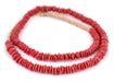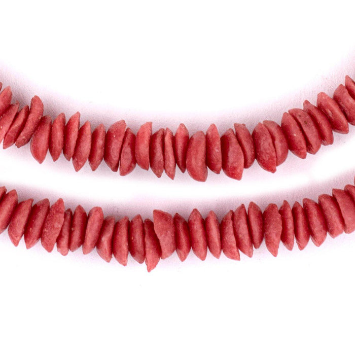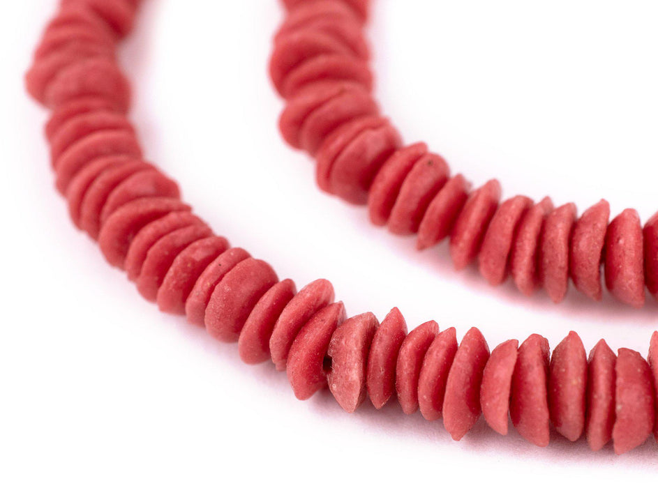 Checkout this beautiful strand of red color Ashanti glass saucer beads. The process of making these beads is unique to Africa and has been used for over 1000 years. Pulverized glass of various colors is poured into a clay mold, using a cassava stem for the bead's hole. The mold is placed in a furnace and heated until the glass particles congeal without actually melting and the stem burns out. The Ghanaians have been making beads in this manner since the 1600s. Each bead measures approximately 2-3 x 9-10mm with a hole size of approximately 2mm. You will receive a full strand measuring approximately 28". Shade of beads may vary slightly from photo. Get yours today!