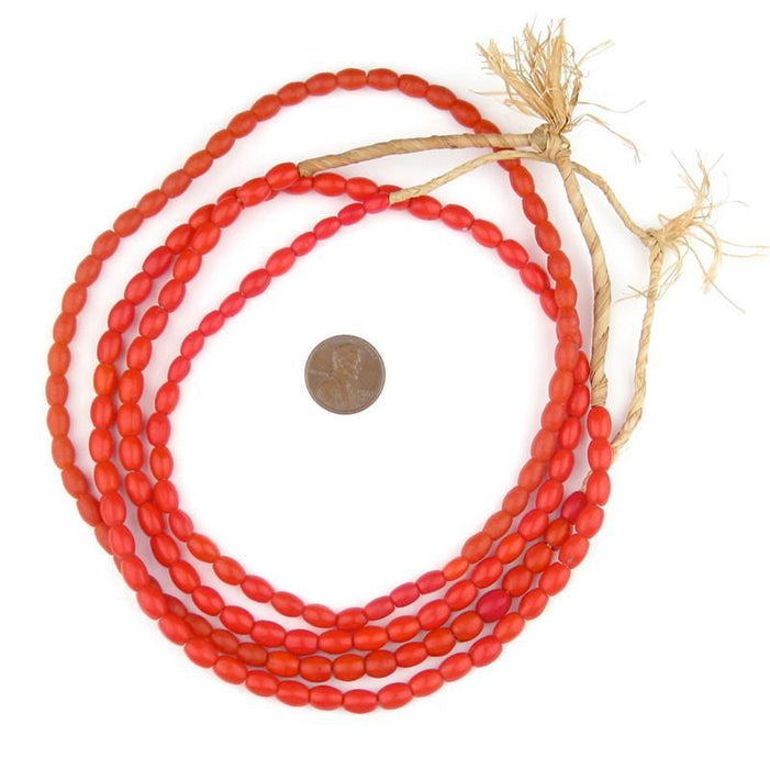 The vibrant red beads are from the West African country of Mali but are likely old European trade beads from Czechoslovakia. The refined oval shape closely resembles the much larger but more common Colodonte bead also made from bohemian glass. This strand measures approximately 24-26" long with individual beads measuring approximately 7-9mm long by 5-6mm in diameter. Two strands shown. Each strand is sold individually.