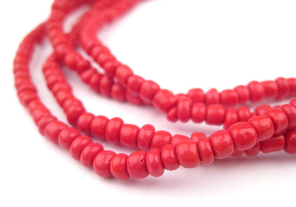 Two strands of red color small glass beads from Africa. Each bead measures approximately 4mm in diameter by 3mm in length. Some variation in individual beads as shown pictured. Shade of red may vary slightly from strand to strand.