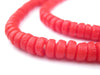 Checkout this beautiful strand of red color Ghana glass disk beads. The process of making these beads is unique to Africa and has been used for over 1000 years. Pulverized glass of various colors is poured into a clay mold, using a cassava stem for the bead's hole. The mold is placed in a furnace and heated until the glass particles congeal without actually melting and the stem burns out. The Ghanaians have been making beads in this manner since the 1600s. Each bead measures approximately 3.5 x 7mm, with holes measuring approximately 2mm.