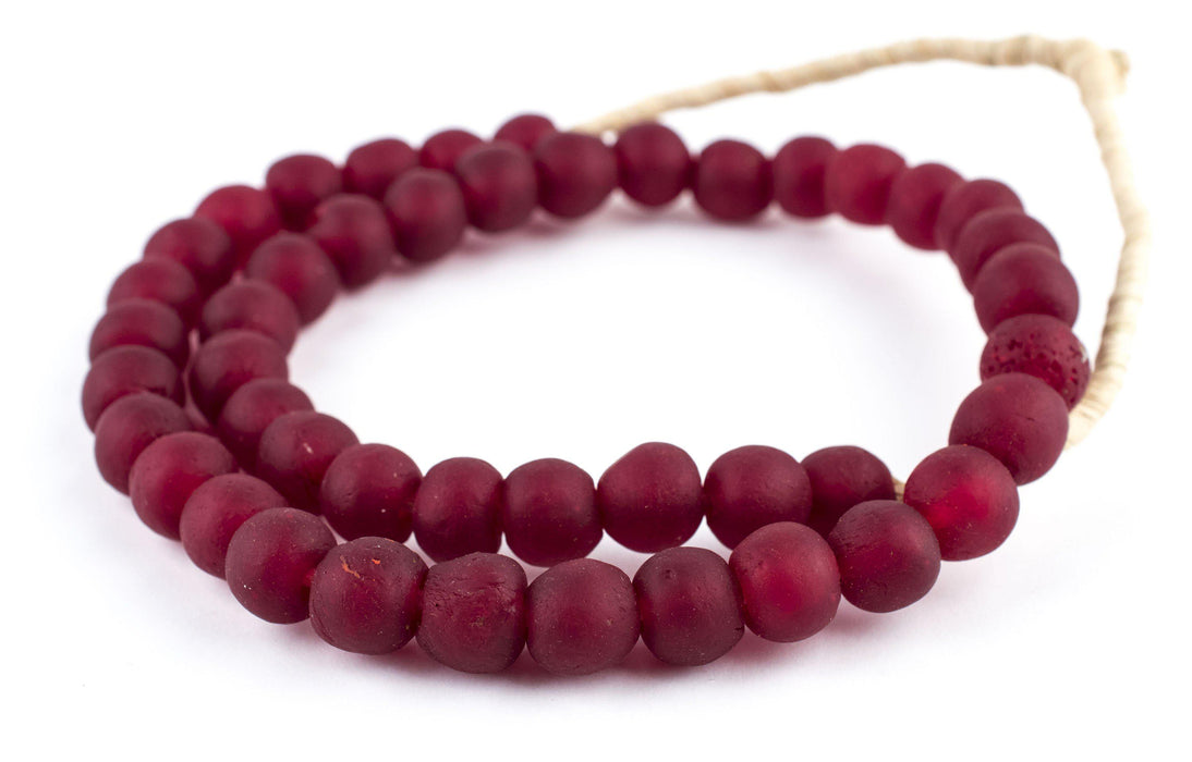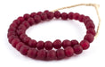 Recycled glass beads are a type of indigenously produced African bead from Ghana West Africa. These beautiful red color recycled beads are made using an old method that has been used for centuries. The glass itself is derived from a variety of recycled sources including old beverage and medicine bottles. The procedure for making the beads consists of a number of steps whereby powdered glass is poured into molds of clay and baked in a specialized oven. These beads are produced in large part by the Krobo tribe and through recycling glass are environmentally friendly. Shade of red may vary slightly from photo.