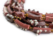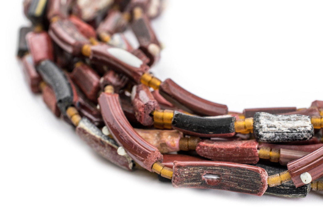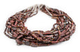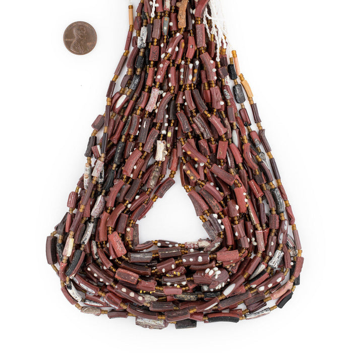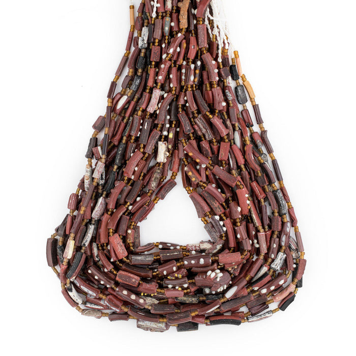 Take a moment to appreciate the true artistry of these Afghani Glass Beads. These alluring beads are said to be very old and are made by using pieces of antique Afghani Bangles, also sometimes identified as Roman Glass. Each bead has its own unique story to tell. These beads have a striking weathered look to them and can make for a great accent piece in your original jewelry designs. These glass bead strands even look great when worn as a simple necklace. Each bead strand is about 30" in length. Each individual bead is approximately 12-17 x 4-5mm and roughly has a 2mm bead stringing hole. Multiple strands pictured. Each strand sold individually. Each strand is unique and bead tones and shapes vary from strand to strand. Grab a strand for yourself and take a piece of history home today. Note that while the material is said to be of old, possibly ancient origin, the precise age of the glass has not been independently verified.