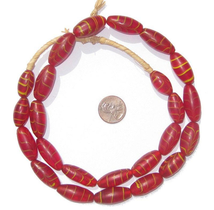 Checkout this beautiful strand of elongated glass from Africa, The strand measures about 25", with beads measuring approximately 19-22mm in length. Some beads may be slightly worn out on the ends due to age.