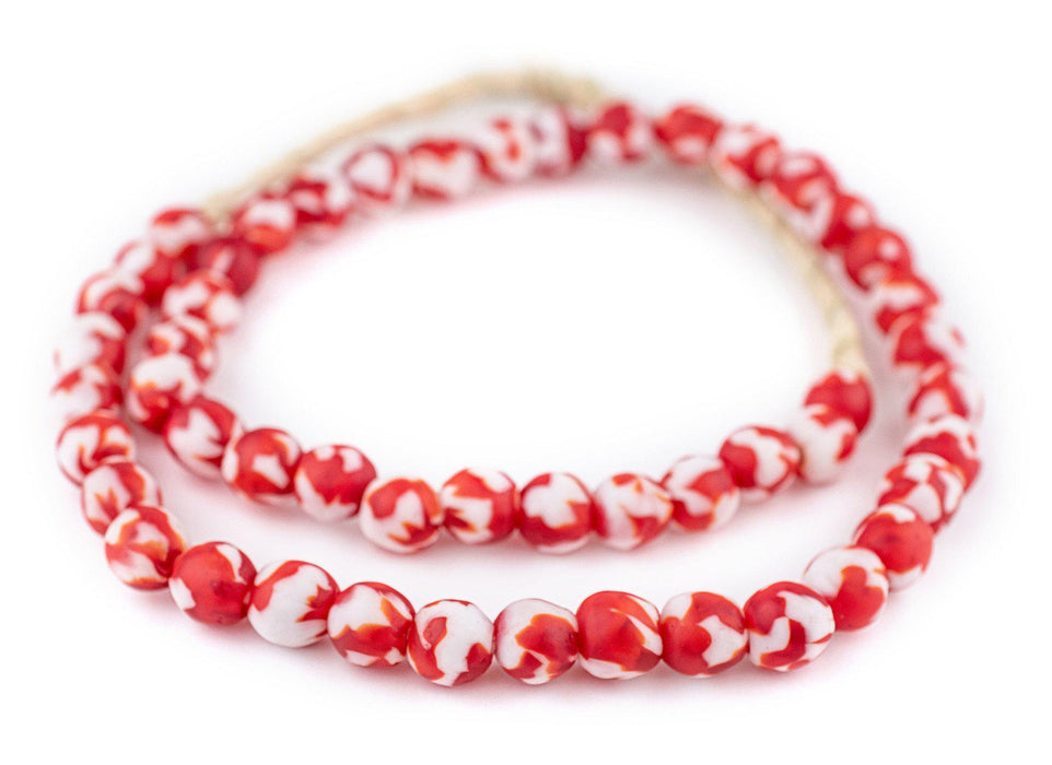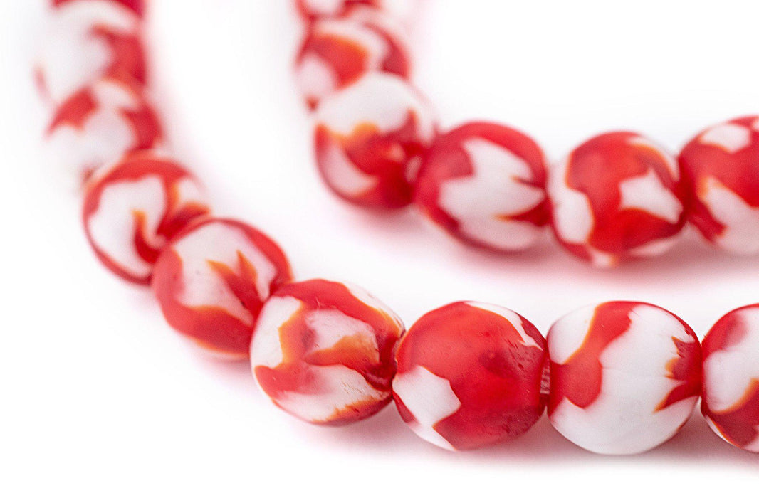 Recycled glass beads are a type of indigenously produced African bead from Ghana West Africa. These beautiful red recycled beads are made using an old method that has been used for centuries. The glass itself is derived from a variety of recycled sources including old beverage and medicine bottles. The procedure for making the beads consists of a number of steps whereby powdered glass is poured into molds of clay and baked in a specialized oven. These beads are produced in large part by the Krobo tribe and through recycling glass are environmentally friendly. Each bead measures approximately 10-11 x 11mm with a hole size of approximately 2-3mm. You will receive a full strand measuring approximately 26".