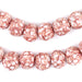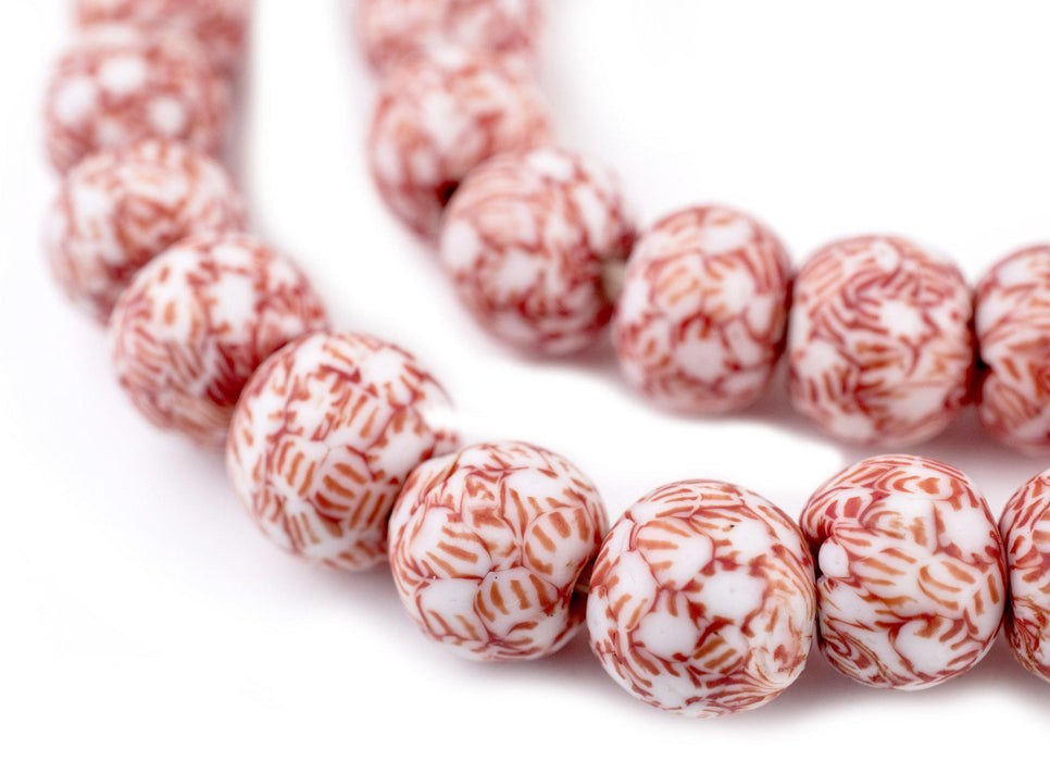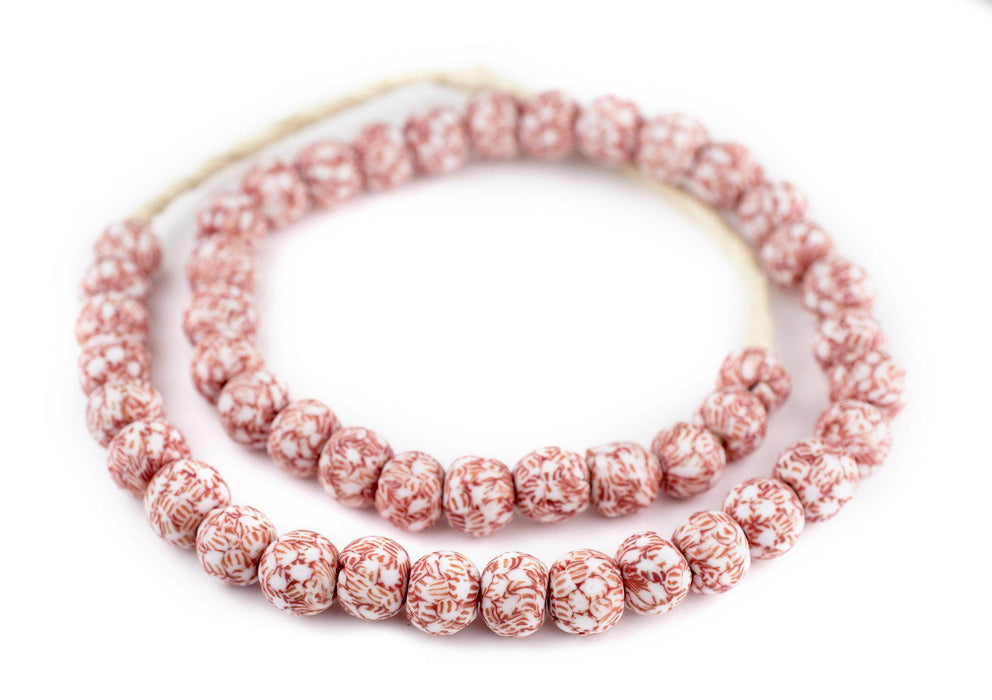 This uniquely patterned strand of round glass beads is made using traditional methods used to create powder glass beads. The procedure for making the beads consists of a number of steps whereby powdered glass is poured into molds of clay and baked in a specialized oven. Individual beads measure 9-11 x 13-14mm and have a hole size of approximately 2-3mm. Style of fuse may vary slightly from strand to strand as shown in different photos. Some strands may show higher concentration of red lines than others.