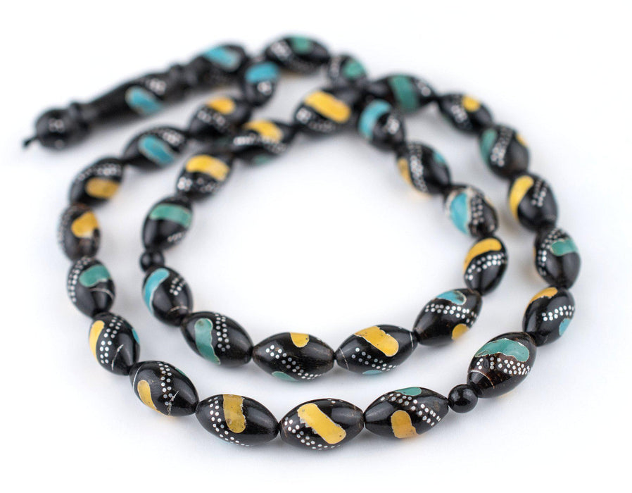 Evocative of a lost world, these beautiful Arabian prayer beads have been handcrafted by a master artisan using authentic black coral. Look carefully and you will see that each bead has been exquisitely inlaid in meticulous detail, a quality of work hard to find in today’s day and age. The refined quality of these beads belies the long journey they have traveled through the back alleys and markets of North Africa. Prayer beads such as these embody the intersection artistic expression and faithful devotion that are a cornerstone of the Islamic world. Each bead on this strand measures approximately 14 x 8mm with hole size of 1mm and strand length of 18" long. Metal inlay may not be sterling. Use as-is or to accent your beaded creations. Get yours today!