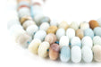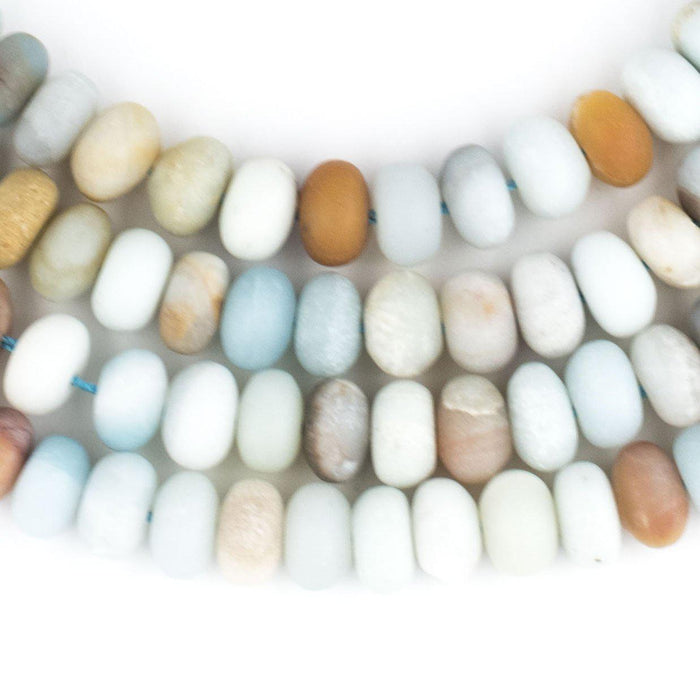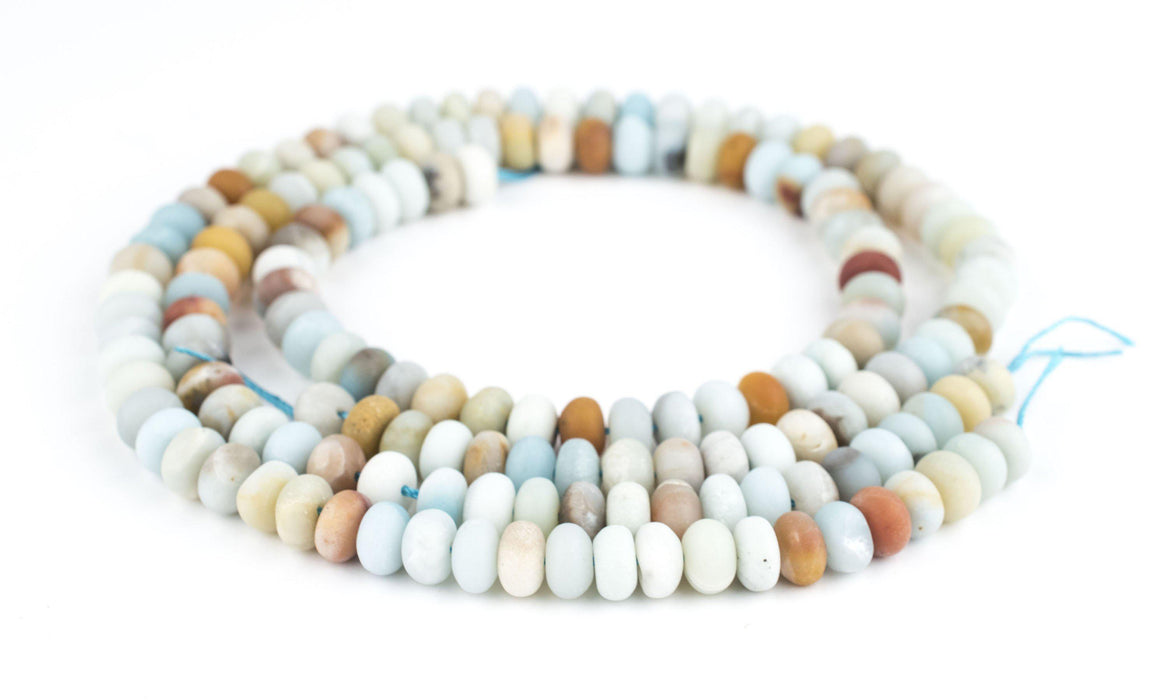 Amazonite, also known as Amazon stone, was first identified near the Amazon river in South America. These beautiful Amazonite stone beads come in a great rondelle shape and have a natural matte finish. Each bead measures approximately 5mm wide x 8mm diameter, and strands measure 15 inches. Two strands pictured. Each strand is sold individually. Shade of colors may vary slightly from strand to strand with varying amount of darker beads.